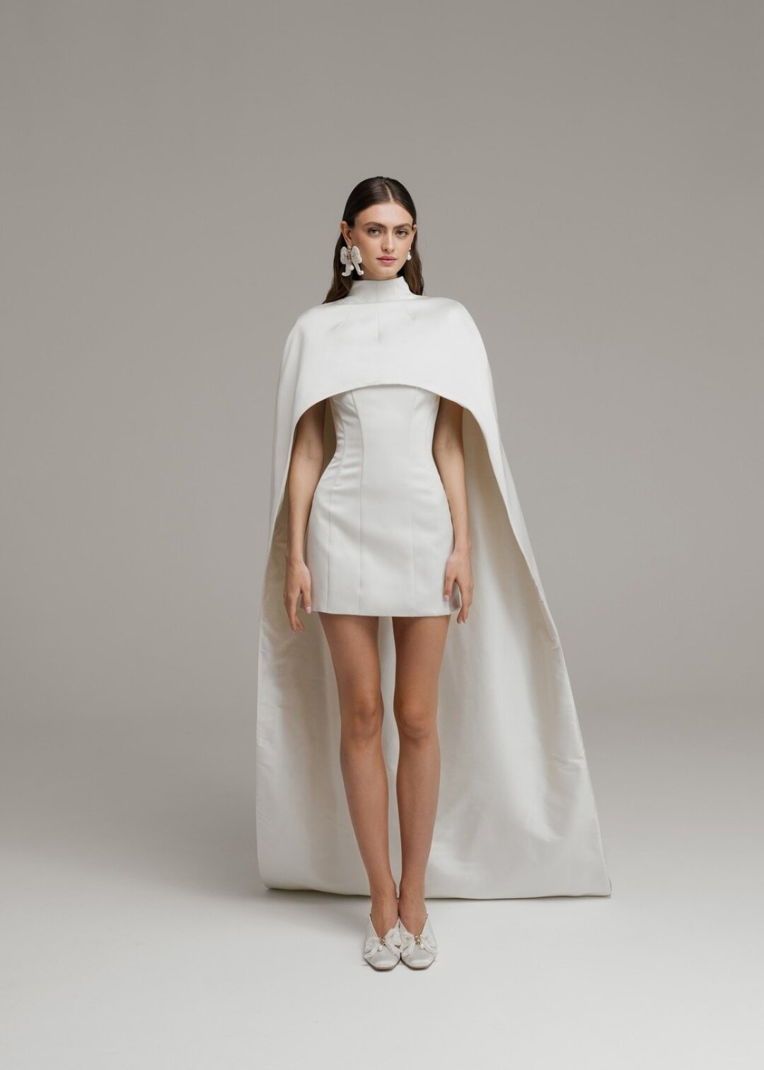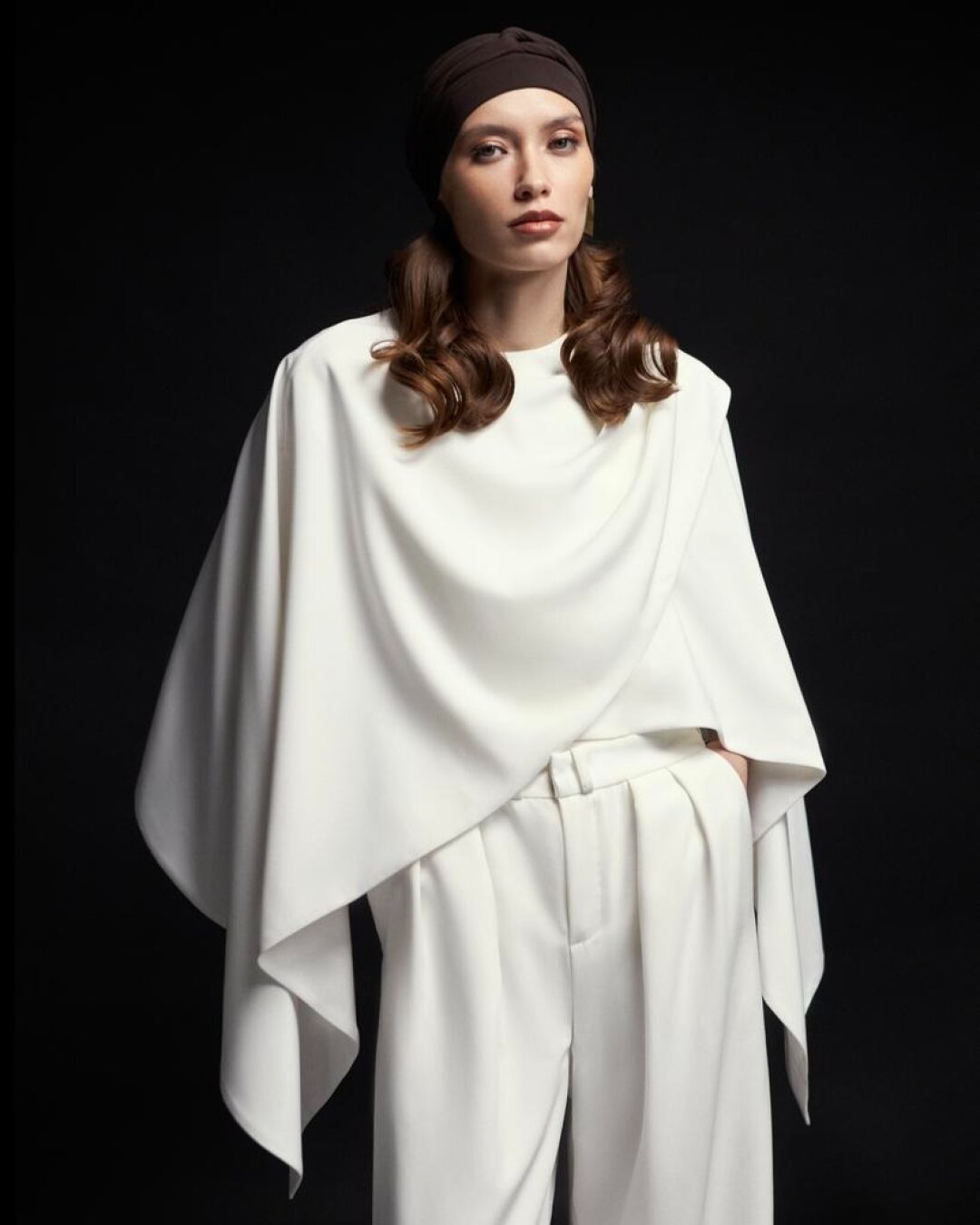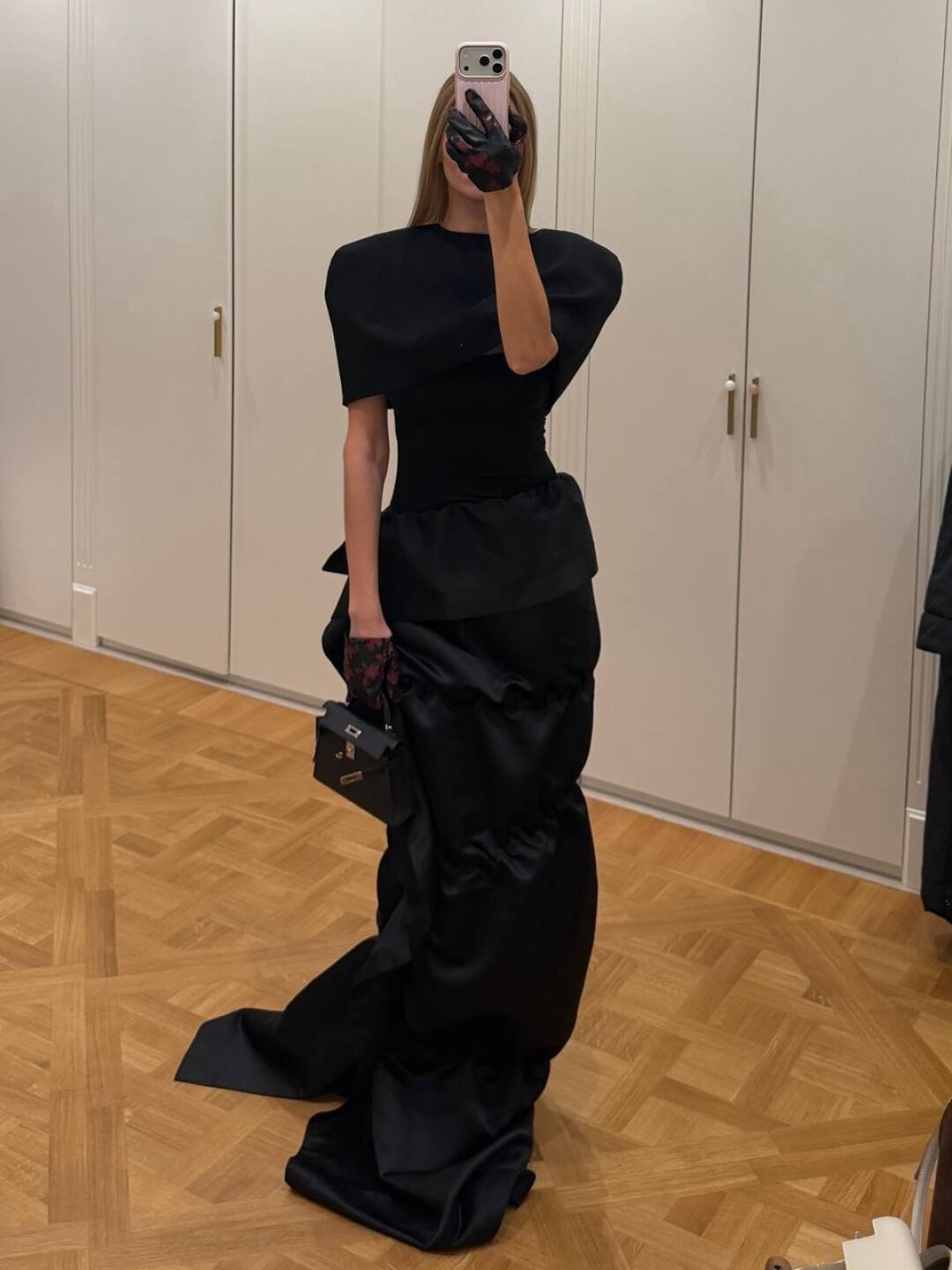 Лук фэшн-инфлюэнсера Полины Зеленовой на 7-ую свадьбу Марии Миногаровой: авангардные драпировки Ushatava + готический кейп Parit
