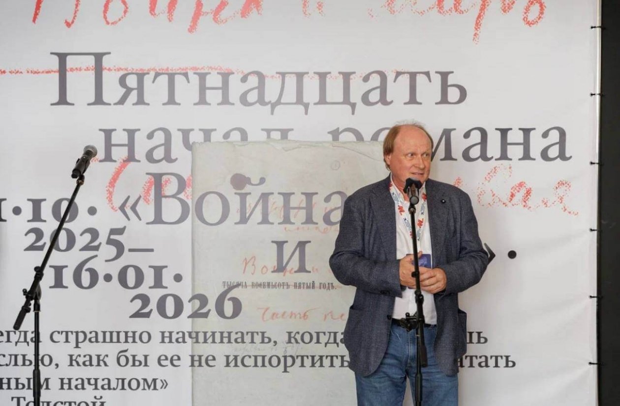 Праправнук писателя, директор Государственного музея Л. Н. Толстого Владимир Толстой открывает выставку «Пятнадцать начал романа "Война и мир"» в Музее-заповеднике истории Дальнего Востока имени В. К. Арсеньева. Фото: Взято из открытых источников