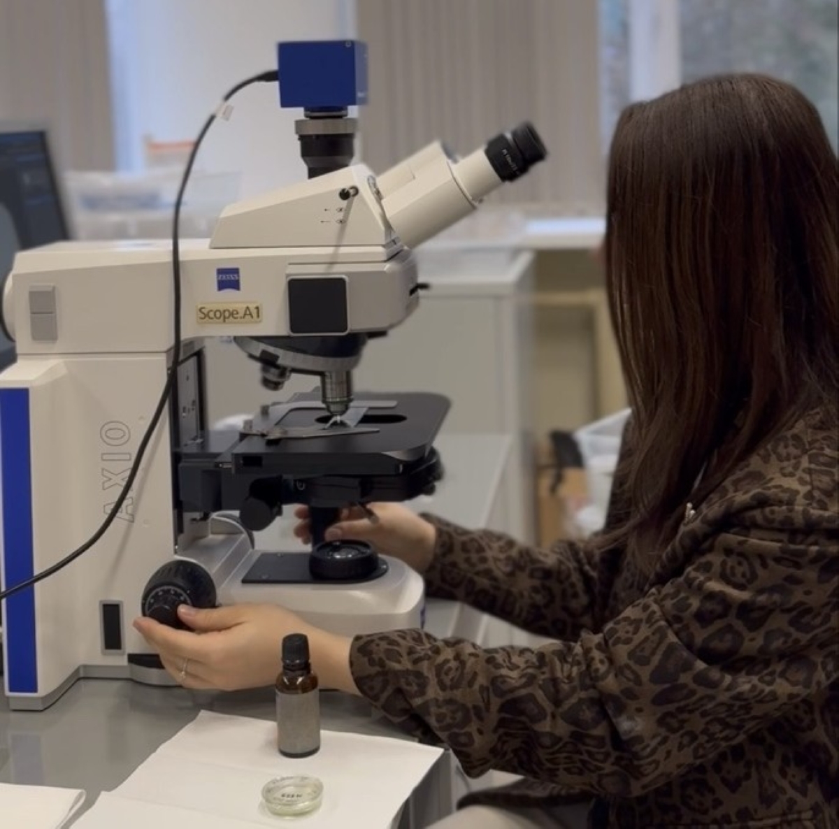 Исполнитель проекта, студентка магистратуры биологического факультета МГУ имени М.В. Ломоносова Элина Миронова во время работы за световым микроскопом. Источник: Элина Миронова