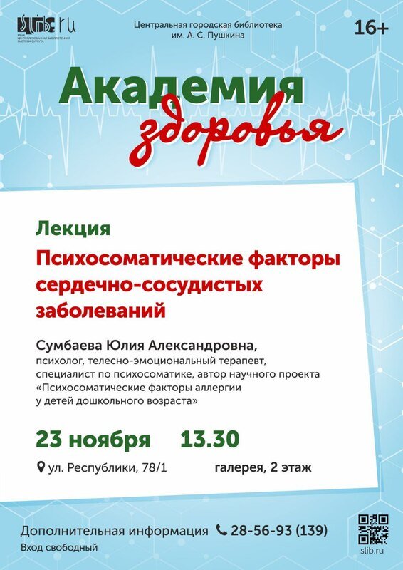 13.30 – лекция «Психосоматические факторы сердечно-сосудистых заболеваний» в Центральной библиотеке им. Пушкина (Республики, 78/1). В рамках проекта «Академия здоровья» психолог и телесно-эмоциональный терапевт Юлия Сумбаева расскажет, какие психологические факторы и эмоции влияют на здоровье сердца и какие приемы помогут предотвратить начало заболевания. Вход свободный.