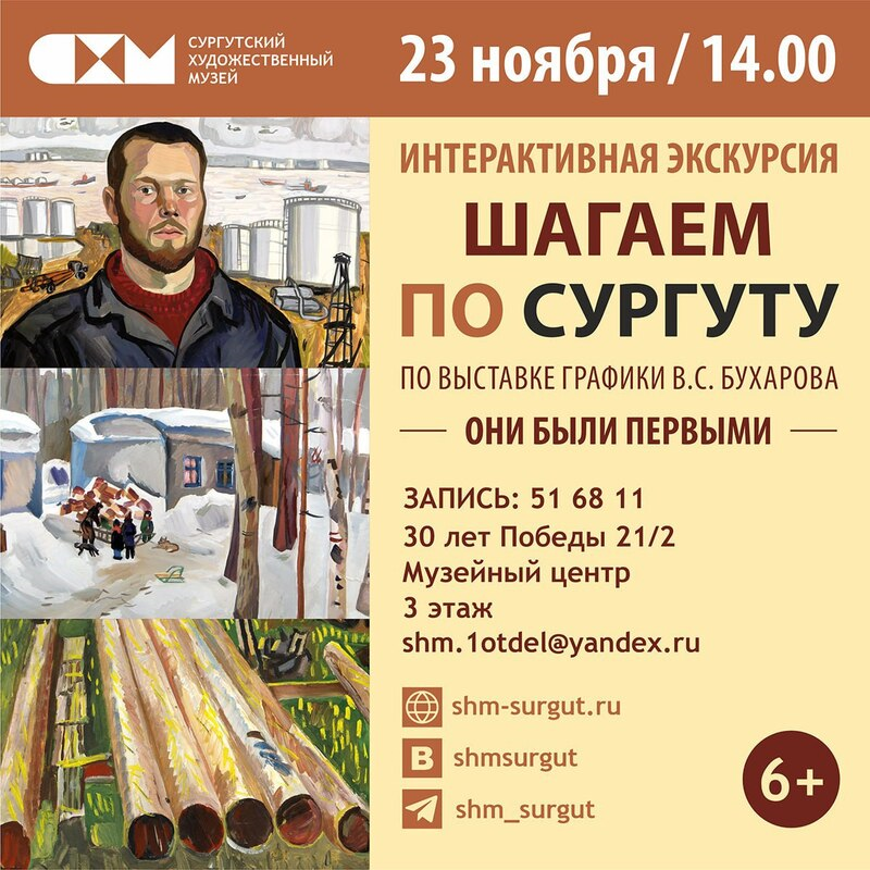 14.00 – интерактивная экскурсия «Шагаем по Сургуту» в Музейном центре (30 лет Победы, 21/2, 3 этаж). Экскурсия по выставке графики В.С. Бухарова «Они были первыми», посвященной 60-летию присвоения Сургуту статуса города. Продолжительность – 45 минут. Стоимость: дети 4-6 лет – 50 рублей, 7-18 лет – 100 рублей, семейный билет – 200 рублей. Запись по телефону 51-68-11.