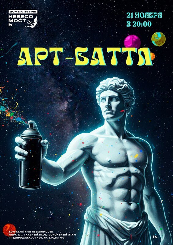 20.00 – Арт-батл в ДК «Невесомость» (Мира, 33/1). Шоу, где художники создают работы в реальном времени на глазах у публики. Восемь талантливых авторов будут сражаться за звание лучшего, а решать, чья работа достойна победы, будут зрители. По мере прохождения турнирной сетки раунды будут удлиняться, а техники – усложняться. Действие будет сопровождаться диджей-сетом, так что гости не только увидят рождение искусства, но и смогут потанцевать. Билеты в предпродаже стоят 400 рублей, в день мероприятия – 700.
