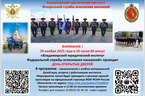 29 ноября 2025 года в 10.00 (МСК) в ФКОУ ВО «Владимирский юридический институт ФСИН России» состоится «День открытых дверей».