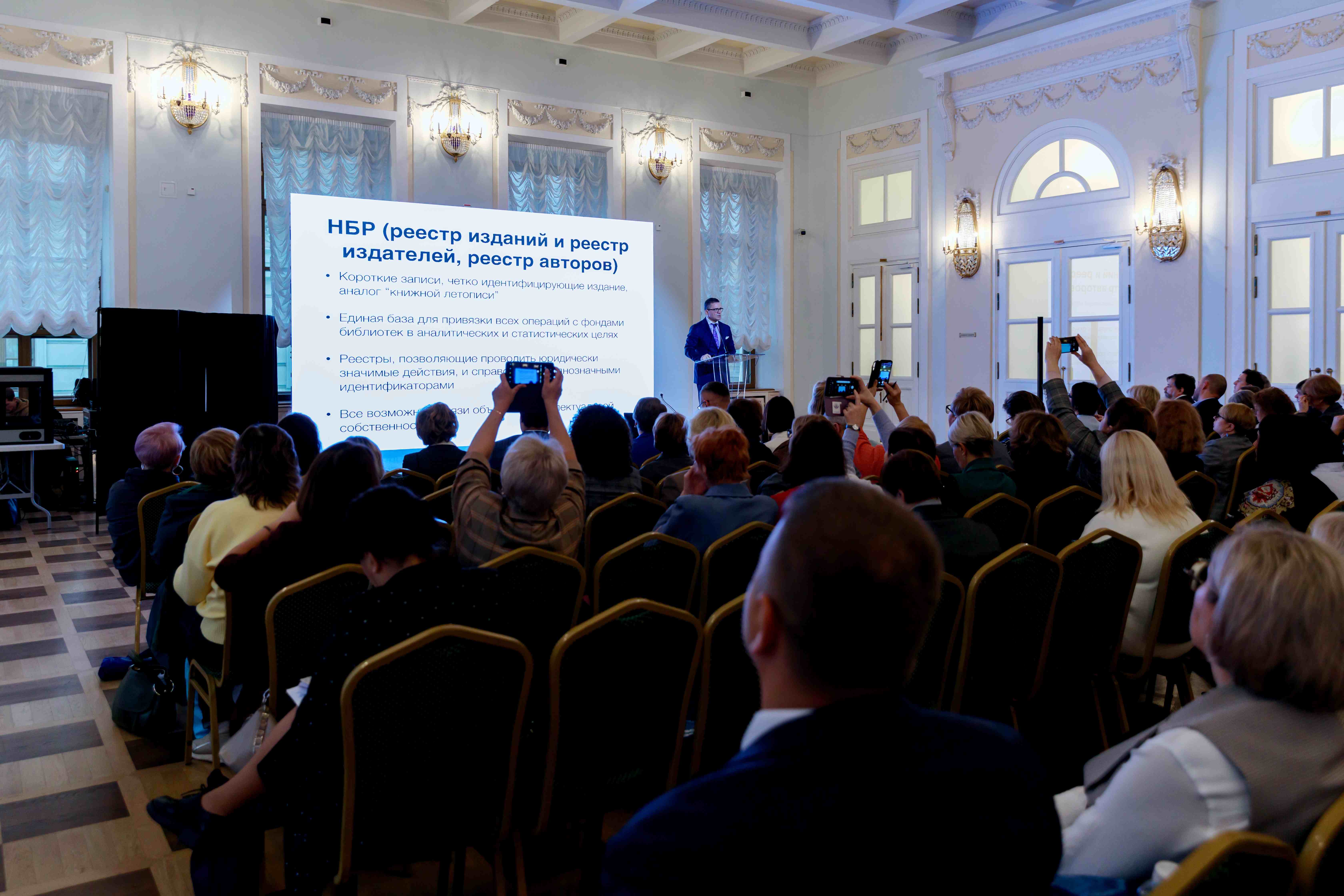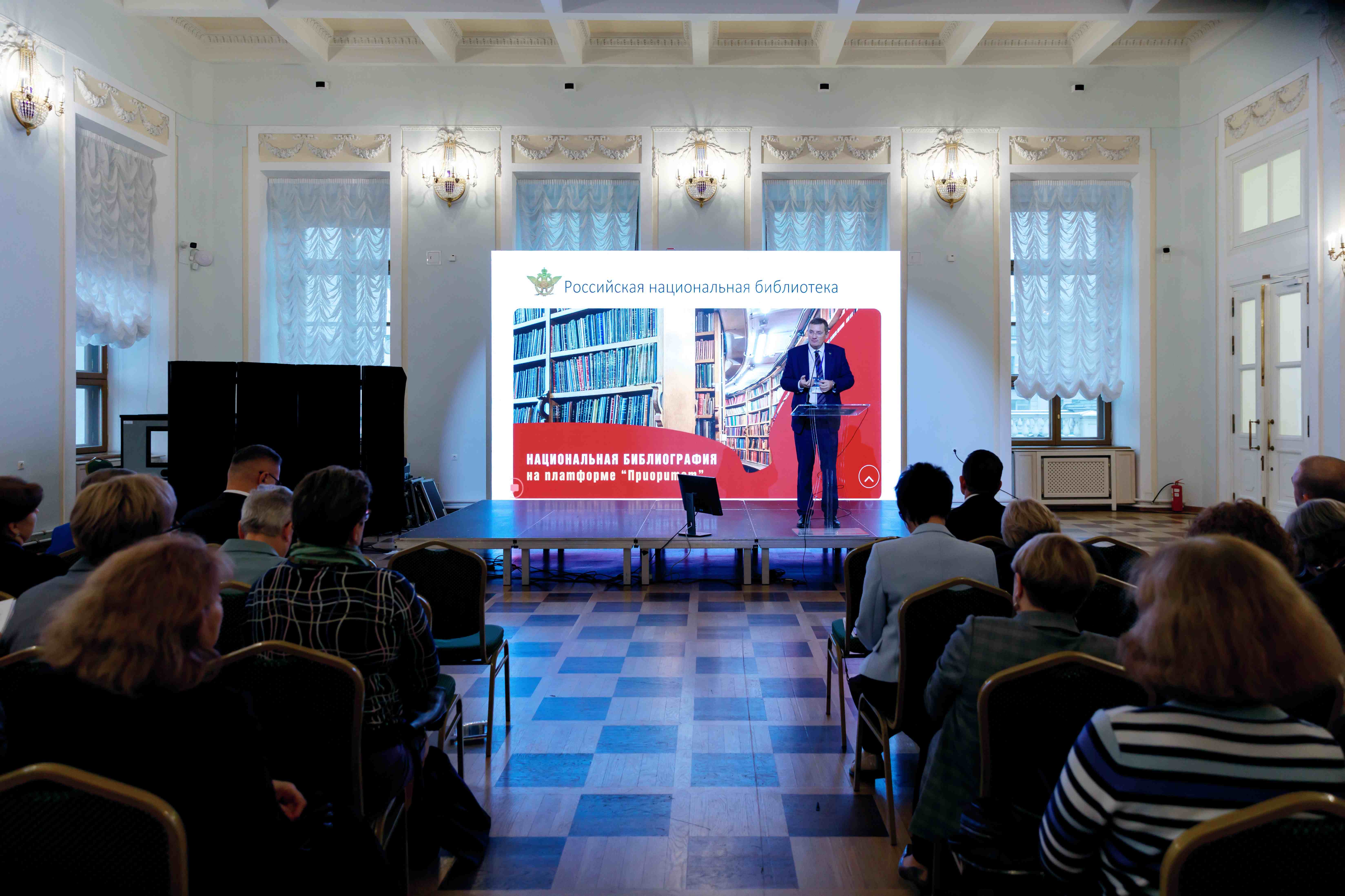 В рамках пленарного заседания с докладом выступил заместитель генерального директора по библиотечной работе С.Б. Голубцов. Станислав Брониславович, в частности, отметил, что Российская национальная библиотека исторически является хранилищем письменной памяти России и активно способствует сохранению и приумножению интеллектуального и культурного наследия, что соответствует задачам, которые отражены в государственной культурной политике. Деятельность РНБ также ориентирована на цифровую трансформацию, которая подразумевает развитие национального цифрового библиографического ресурса, внедрение новейших технологий, создание информационного суверенитета.