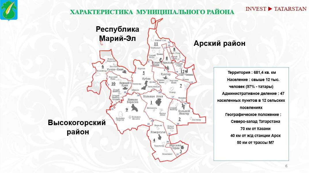 В Атнинском районе нет промышленных парков и площадок. Однако, как отметила руководитель Агентства инвестиционного развития ТатарстанаТалия Минуллина, есть другие особенности, которые делают его интересным для инвесторов.