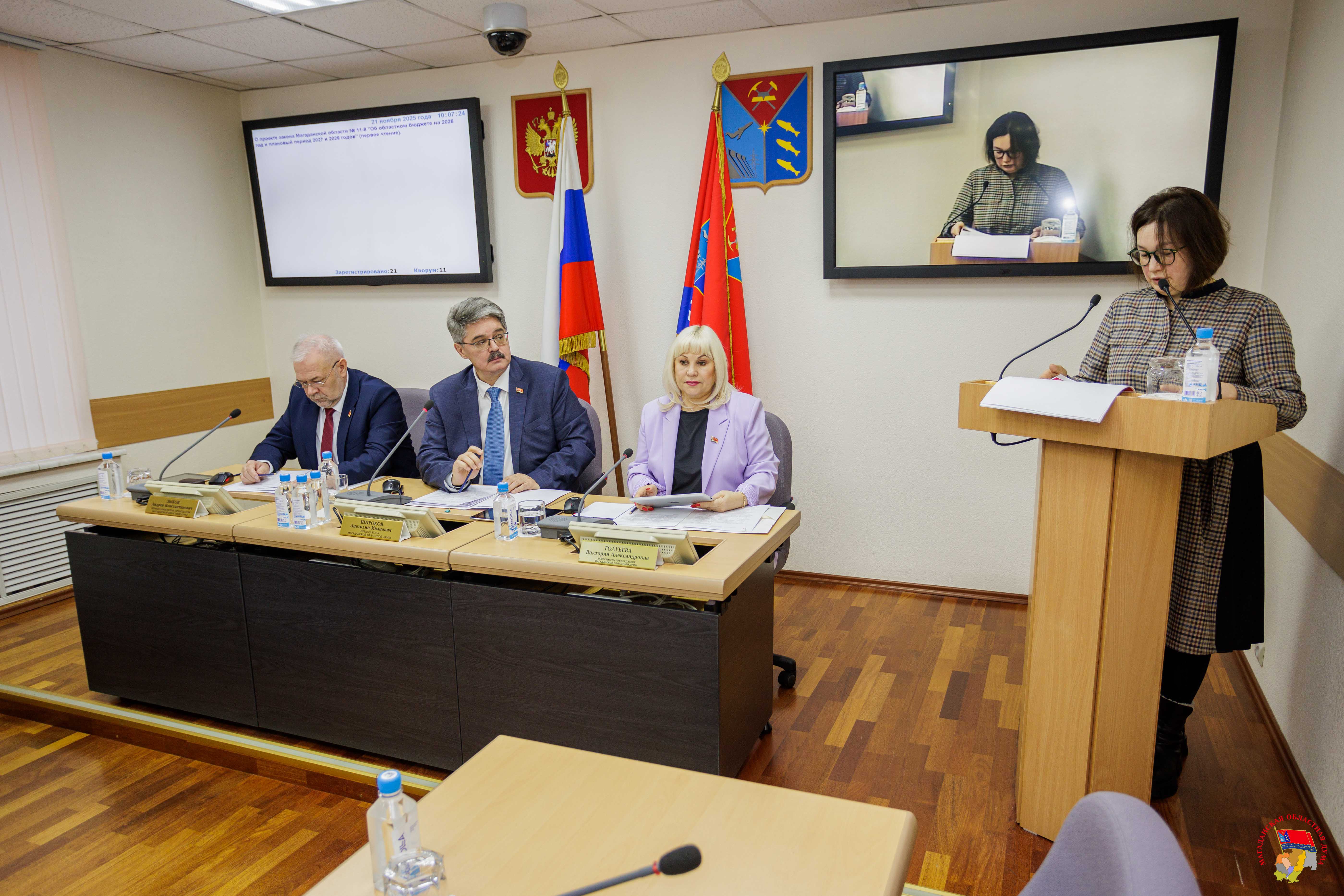 21 ноября 2025 года прошло третье заседание Магаданской областной Думы восьмого созыва. В нем принял участие Губернатор Магаданской области Сергей Носов, а также профильные министры, руководители ведомств, а также впервые - участники программы "СВОи Герои 49" и курсант программы «Муравьев-Амурский». Депутаты рассмотрели 18 вопросов повестки, приняли семь законов Магаданской области в окончательной редакции, три закона — в первом чтении, а также восемь постановлений, касающихся как законодательной деятельности, так и стратегических направлений социально-экономического развития региона. В числе принятых законов — нормативные акты, направленные на совершенствование полномочий органов власти в сфере культуры, развитие патентной системы налогообложения, усиление градостроительного регулирования, повышение уровня пожарной безопасности, а также расширение мер социальной поддержки для многодетных семей и семей с детьми. Особое внимание было уделено подготовке бюджетной политики на среднесрочный период. В первом чтении приняты ключевые финансовые документы: «Принимая бюджет на 2026 год, мы делаем ставку на два главных приоритета — развитие региона и рост благосостояния наших жителей. Мы продолжим реализацию крупных инфраструктурных проектов, обеспечим справедливый уровень оплаты труда в бюджетной сфере, сохраним социальную стабильность. И самое главное — будем действовать ответственно», — отметил Губернатор Магаданской области Сергей Носов. Основные параметры бюджета представила министр финансов Магаданской области Диана Самандас. Доходы на 2026 год планируются в сумме 88,6 млрд руб., расходы - 89,9 млрд руб. Дефицит прогнозируется в размере 1,6% утвержденного общего годового объема доходов без учета безвозмездных поступлений. Как подчеркнула министр, «ко второму чтению будут увеличены и налоговые, и неналоговые доходы». Расходная часть бюджета сфокусирована на прямой поддержке колымчан и развитии территории. Учтены ежегодное повышение оплаты труда отдельных категорий работников, индексация публичных нормативных обязательств и стипендиального фонда, расходы на оплату коммунальных услуг областными государственными учреждениями. «Детский бюджет» сформирован в объеме 16,1 млрд рублей, что составляет почти пятую часть всех расходов. Парламентарии единогласно приняли пакет поправок в региональное законодательство, направленных на дополнительную поддержку семей с детьми. Инициатором изменений в закон «О мерах социальной поддержки многодетной семьи в Магаданской области» стал Губернатор Колымы Сергей Носов, в закон «О дополнительных мерах социальной поддержки семей, имеющих детей» - прокурор Магаданской области Дмитрий Разуваев. Так, с 1 января 2026 года семьи с тремя и более детьми, если у старшего ребенка в возрасте до 23 лет установлена инвалидность, будут иметь право на получение мер соцподдержки, независимо от того, проходит данный ребенок обучение или нет. Ранее этот факт был обязательным условием для получения ряда мер поддержки. Также сокращен срок рассмотрения заявления о распоряжении средствами регионального материнского (семейного) капитала с пятнадцати до пяти рабочих дней. «Мы видим, что в регионе реализуется большое количество мер социальной поддержки. Отмечу, важно не количество, а реальный эффект для 