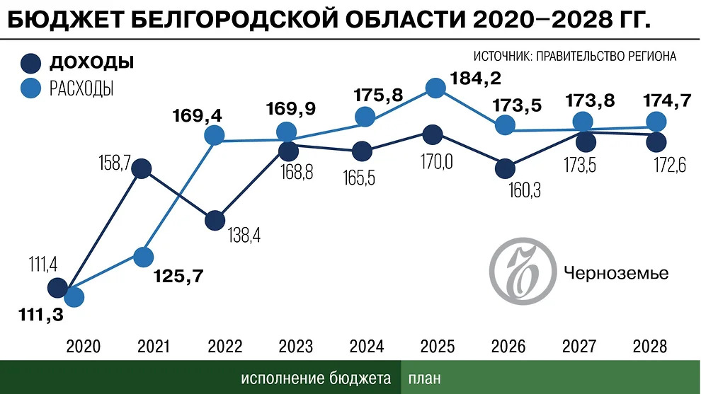 В Белгородской области началось обсуждение проекта бюджета на 2026 год. Согласно представленным документам, доходная часть может составить 160,3 миллиарда рублей — это самый низкий показатель за последние три года.