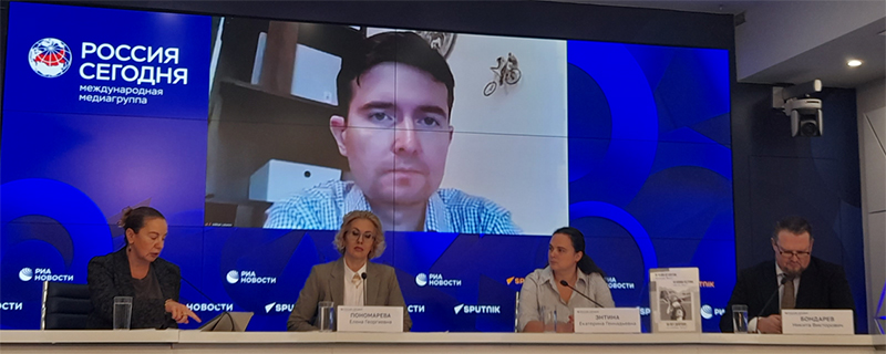 Круглый стол «Босния и Герцеговина: неоднозначные плоды международного протектората. К 30-летию Дейтонских соглашений». Слева направо: О.Буряк (модератор, МИА «Россия сегодня»), Е.Пономарева (МГИМО (У) МИД России), Е.Энтина (НИУ «Высшая школа экономики»), Н.Бондарев (Институт славяноведения РАН). По видеосвязи выступает М.Лобанов (Институт экономики РАН). Фото А.Торина.