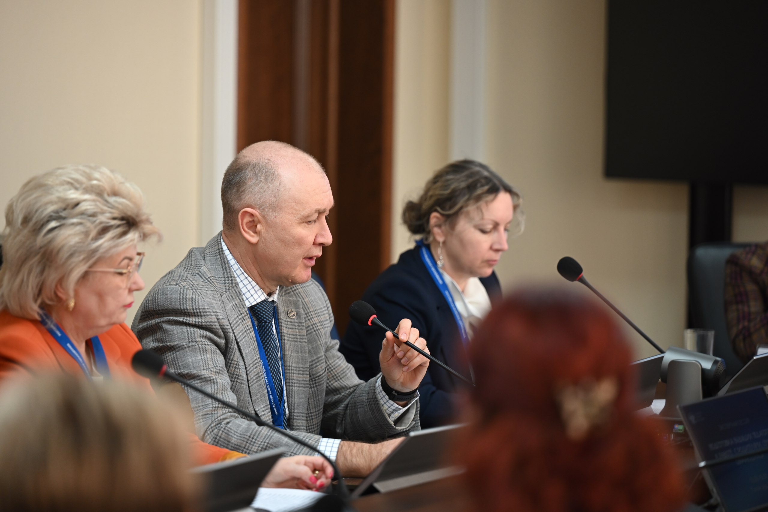 Заместитель директора Департамента кадровой политики Минпросвещения России Сергей Степанович Антонов в своем выступлении представил итоги приемной кампании 2025/2026 учебного года в педагогических вузах Минпросвещения России. Он подчеркнул, что контингент студентов в вузах Российской Федерации, реализующих УГСН 44.00.00 «Образование и педагогические науки», в 2024 году численно превышает 500 тысяч человек, что на 14,5% больше значения 2020 года. При этом 65% из них – студенты бюджетной формы обучения.