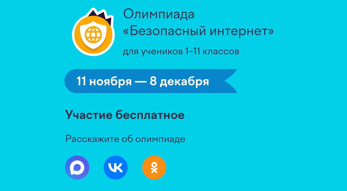 С 11 ноября по 8 декабря 2025 года проходит Всероссийская онлайн-олимпиада «Безопасный интернет» для школьников 1–11 классов.