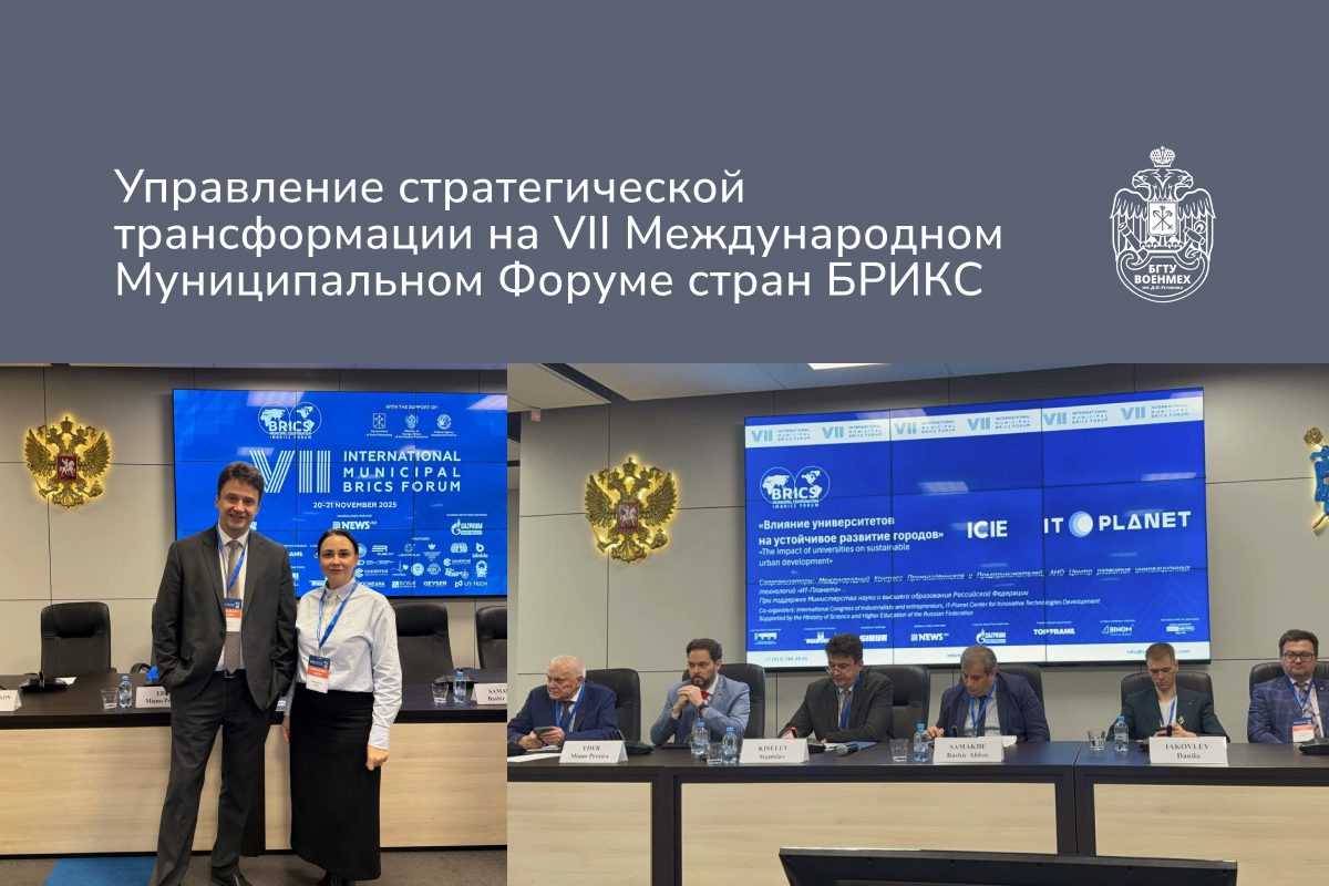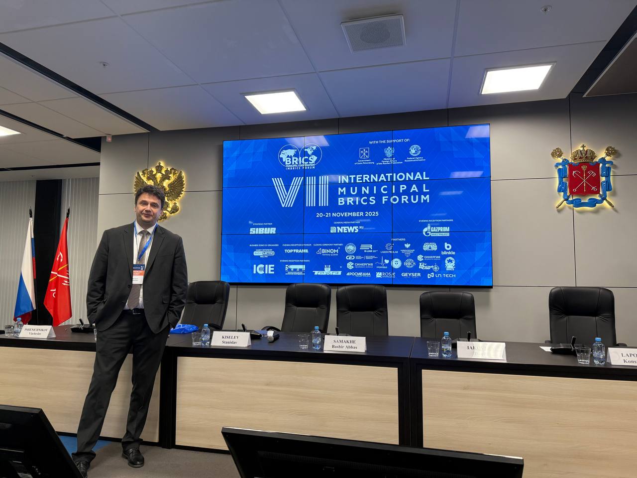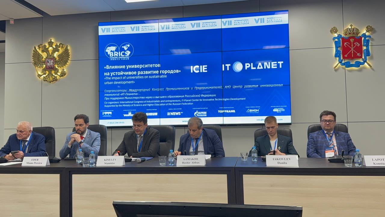 20 ноября Управление стратегической трансформации в лице его начальника Киселева Станислава Борисовича и Медведевой Ольги Евгеньевны, руководителя Центра технологического предпринимательства, посетили блок «Образование, наука и инновации» VII Международного муниципального форума стран БРИКС+. На экспертной сессии Станислав Борисович Киселёв выступил с докладом «Вклад университетов в устойчивое развитие городов».