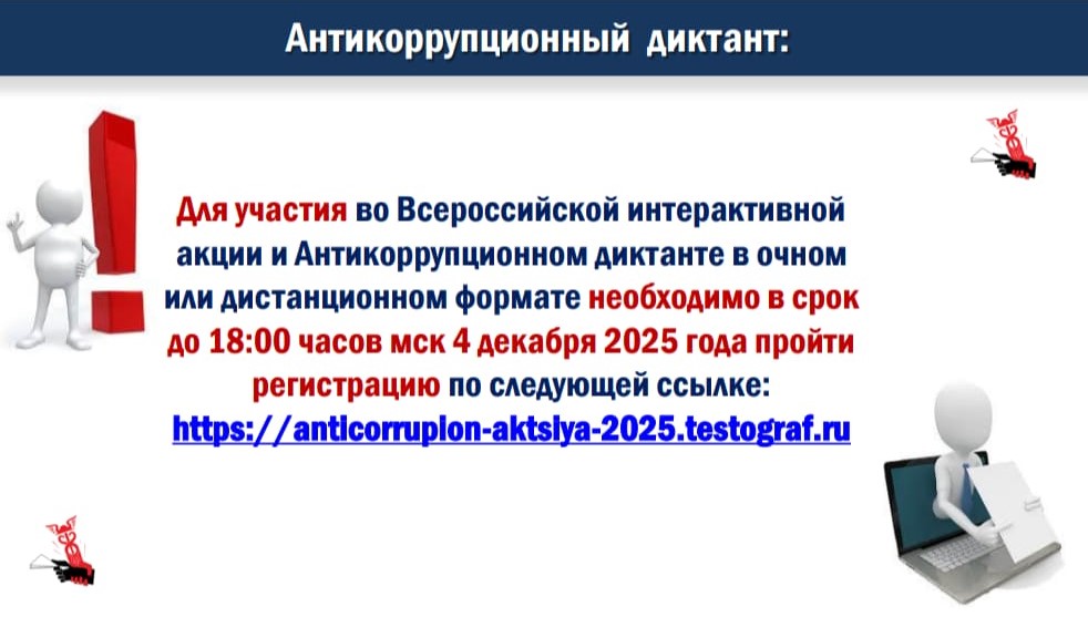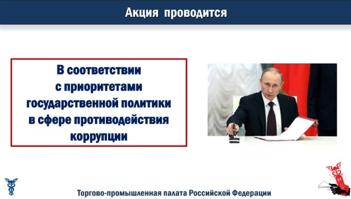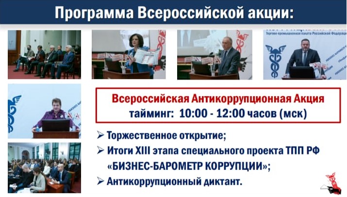 Информируем Вас о том, что 9 декабря 2025 года, в соответствии с приоритетами государственной политики в сфере противодействия коррупции, Торгово-промышленная палата Российской Федерации проводит в очно-заочном формате Всероссийскую акцию, приуроченную к ежегодно отмечаемому Международному дню борьбы с коррупцией.