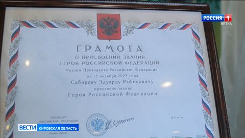 Награду семье героя вручили Губернатор Кировской области Александр Соколов и исполняющий обязанности командующего ВДВ генерал-майор Александр Корнев. По распоряжению губернатора, в ближайшее время будет открыта памятная доска на фасаде школы, где учился Эдуард Сабиров, а также появится Парта Героя.