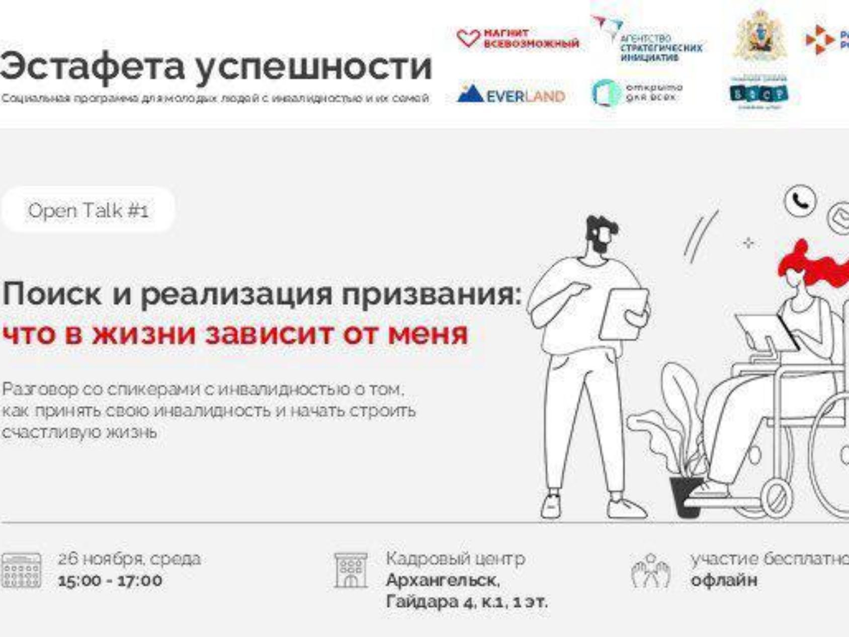 Первое мероприятие состоится 26 ноября в Архангельском областном центре занятости населения и будет посвящено теме поиска профессионального призвания. Участники услышат истории людей с инвалидностью, достигших успеха в профессиональной и общественной сфере. Среди спикеров — режиссёр монтажа и графический дизайнер Ян Кузнецов, тревел-блогер Андрей Антонюк и кадровый консультант Анна Васильева. Эксперт площадки — медицинский психолог Наталья Зубкова.