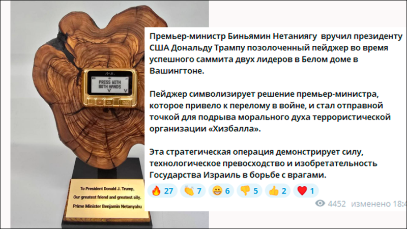 "Взорвавшийся" пейджер, а вокруг - воронка взрыва. Подарок Трампу от Нетаньяху. ТГ-канал советника офиса премьер-министра Израиля Дмитрия Гендельмана, скриншот страницы
