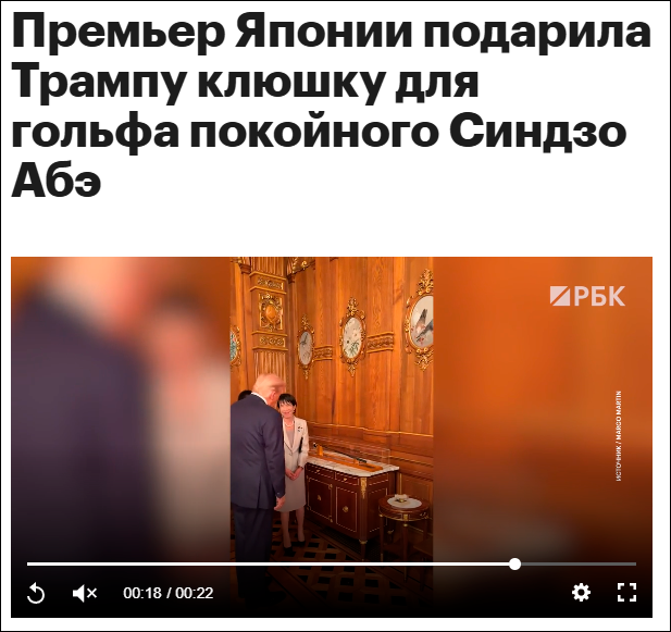 Премьер-министр Японии Санаэ Такаити демонстрирует Трампу клюшку покойного Синдзо Абэ, которого застрелили в 2022 году, сайт РБК, скриншот страницы
