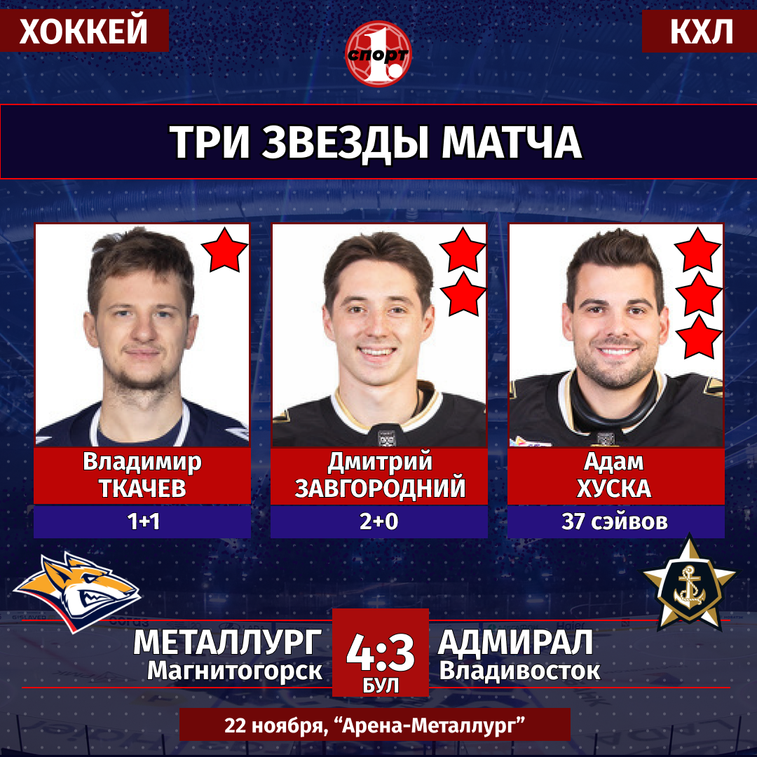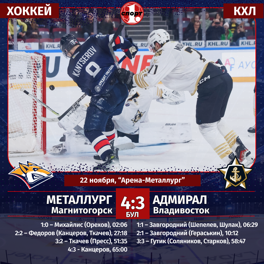 Хоккей. Сезон-2025/2026. Чемпионат КХЛ. 22 ноября. «Металлург» (Магнитогорск) — «Адмирал» (Владивосток) — 4:3 бул (1:2, 1:0, 1:1, 1:0).