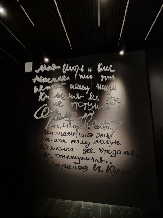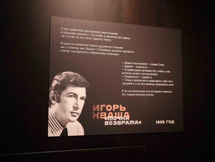 После просмотра выставки журналистам подробно рассказали о содержании кулуаров по обе стороны от главной стены. В крыле Олега Ефремова взгляд сразу падает на возвышающиеся полотна с его фотографиями и цитатами современников, коллег о нём. Напротив них – выставлены за стеклом предметы, которые когда-то обитали в кабинете Ефремова. Краска для грима, пепельница, чашка крепкого чёрного чая, советская литература и черно-белая проекция Олега Ефремова. Вот он берёт книгу и садится за рабочий стол. Вот приближается кадр, и гости видят знакомый профиль, а, если сделать несколько шагов вперёд, можно прочитать написанную кровью клятву Олега Ефремова и Игоря Кваши: «Понимаем, что это решает нашу жизнь. Клянёмся – всё отдать. Не отступить».