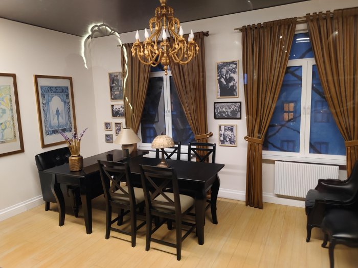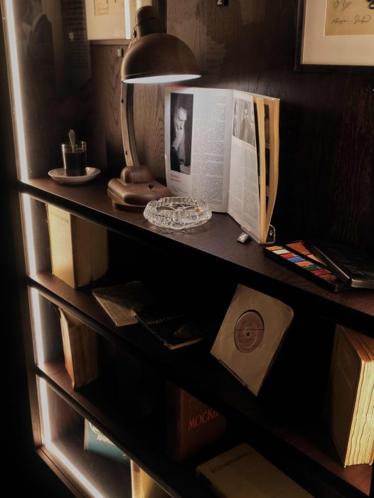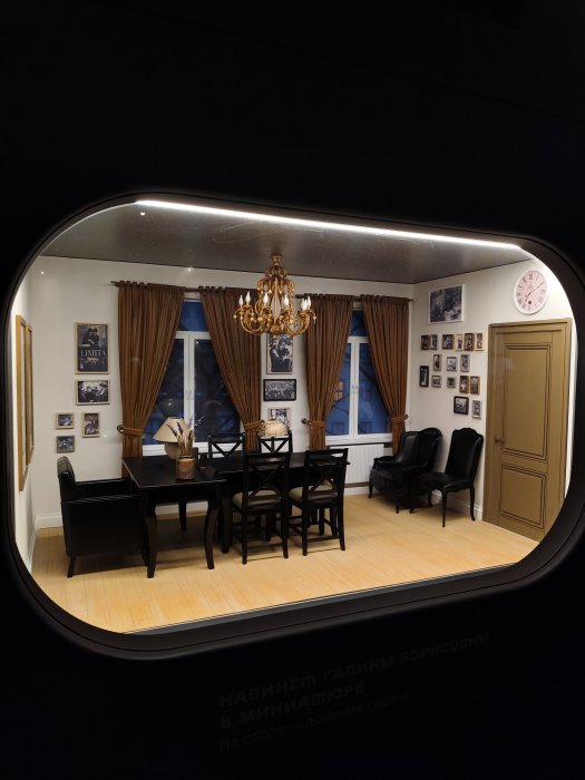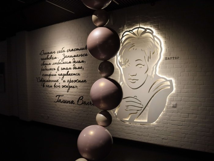 В кулуаре Галины Волчек атмосфера по-особенному трепетная, осторожная, проникающая. При входе сразу ощущается торжественность. Также воссозданы цитаты и проиллюстрированы фотокарточками, но только от одного взгляда на сверкающие в приглушённом свете бело-пурпурные бусы замирает экскурсионное время, чтобы все гости могли запомнить каждую деталь: редкие фотографии, миниатюра её кабинета с обожаемой сиренью в золотистой вазе, флаконы французского парфюма и дорогие сердцу авторы – Чехов, Ремарк, Гончаров.