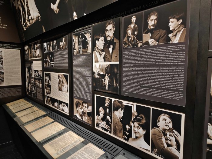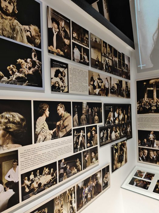Следующей остановкой тура стало фойе Основной сцены. К 70-му, юбилейному, сезону «Современник» подготовил масштабную мультимедийную выставку, которую гости и зрители смогут увидеть за час до начала любого спектакля. Закрытые чёрные арки по бокам от экспозиции создают эффект невидимых кулис, пока в центре, на сцене, расцветает могучее древо. И оно очень символичное. В нём заключена структура театра, его жизнь и непрерывность творческого пути. У «Современника» крепкие корни – их бережно сохранённая история, а толстые, плотные ветви инсталляции, что воздушно тянутся к будущему, говорят о творческих экспериментах, о молодых артистах, спектаклях, современных мотивах. И аккуратные концы ветвей ведут к двум кулуарам. Первый посвящен фигуре Олега Ефремова, другой – Галине Волчек.