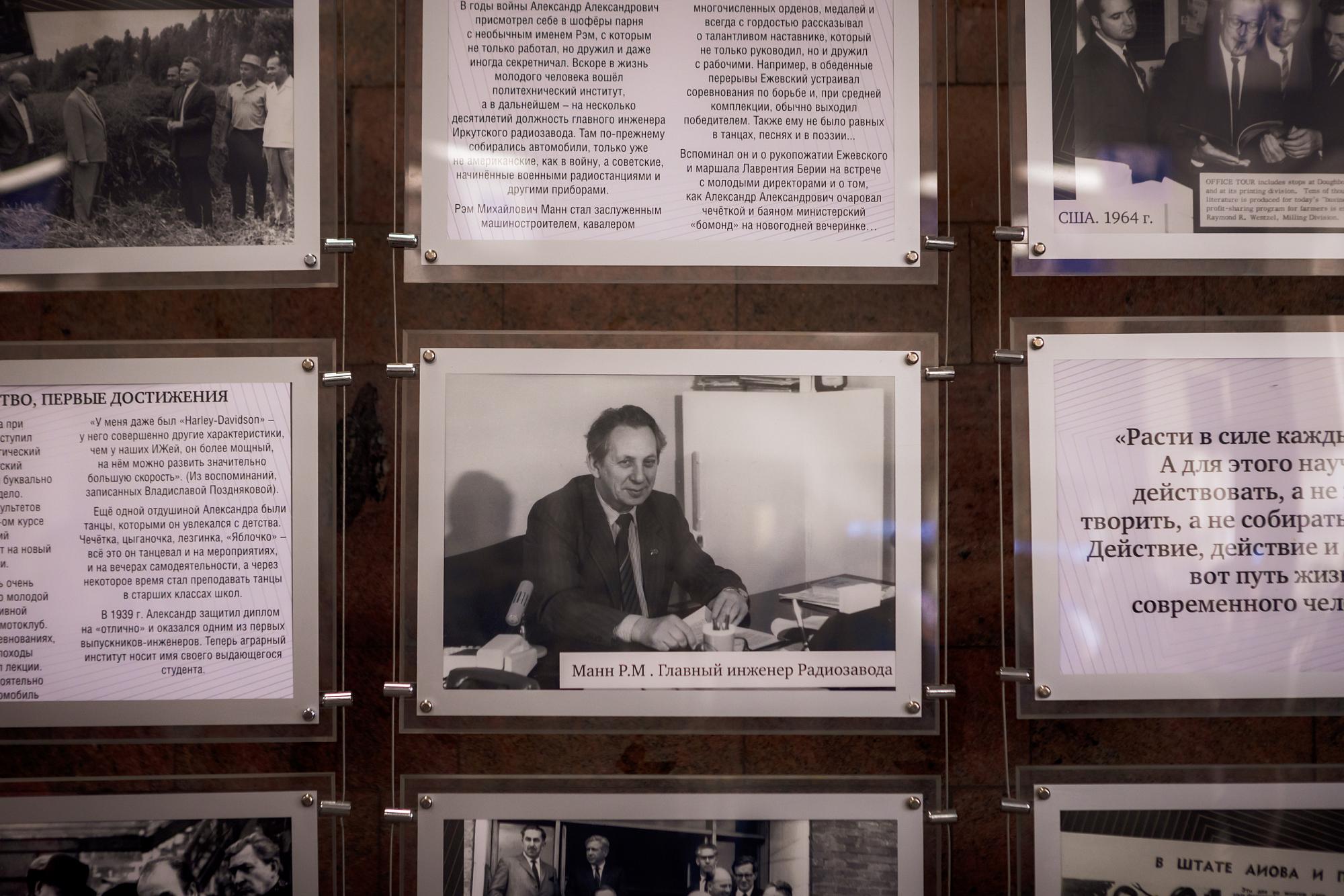 Выставка посвящена 110-летию со дня рождения Александра Ежевского, который прошел путь от токаря Иркутского завода тяжёлого машиностроения до министра тракторного и сельскохозяйственного машиностроения СССР.