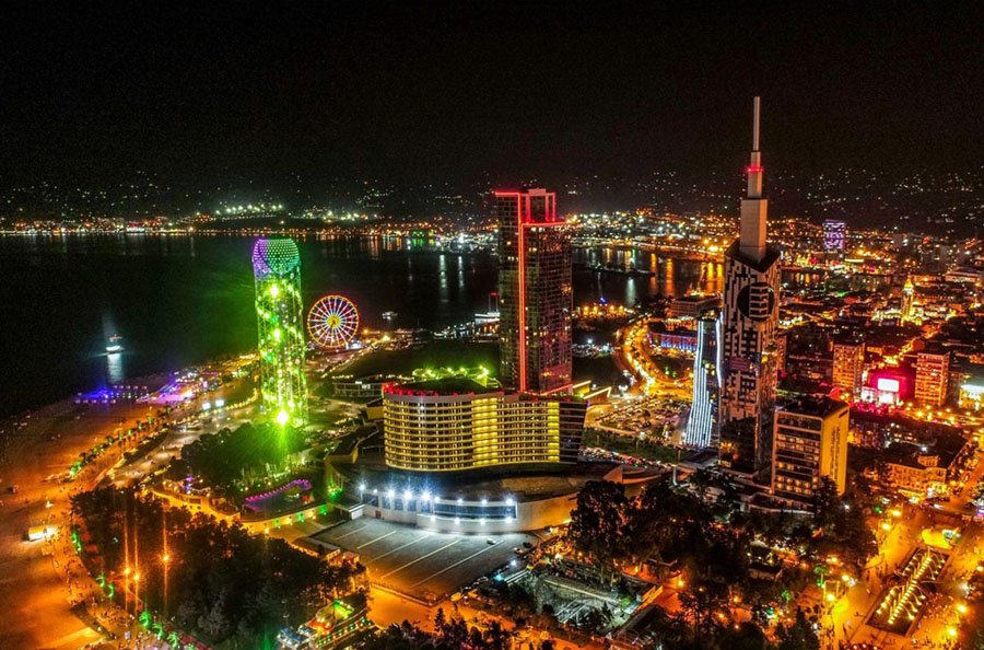 Батуми в зимний сезон предлагает другой формат отдыха — у моря, с мягким климатом и спокойной атмосферой. Город тоже украшают. Вечером Батуми выглядит особенно ярко — гирлянды на пальмах, праздничные инсталляции и украшенные фасады создают ощущение южного зимнего курорта. Главные мероприятия проходят на площади Европы, где устанавливают ёлку, сцену и тематические зоны. Здесь проводят концерты, развлекательные программы и небольшие ярмарки с уличной едой и сладостями. Аналогичные программы и на площади Пьяцца.