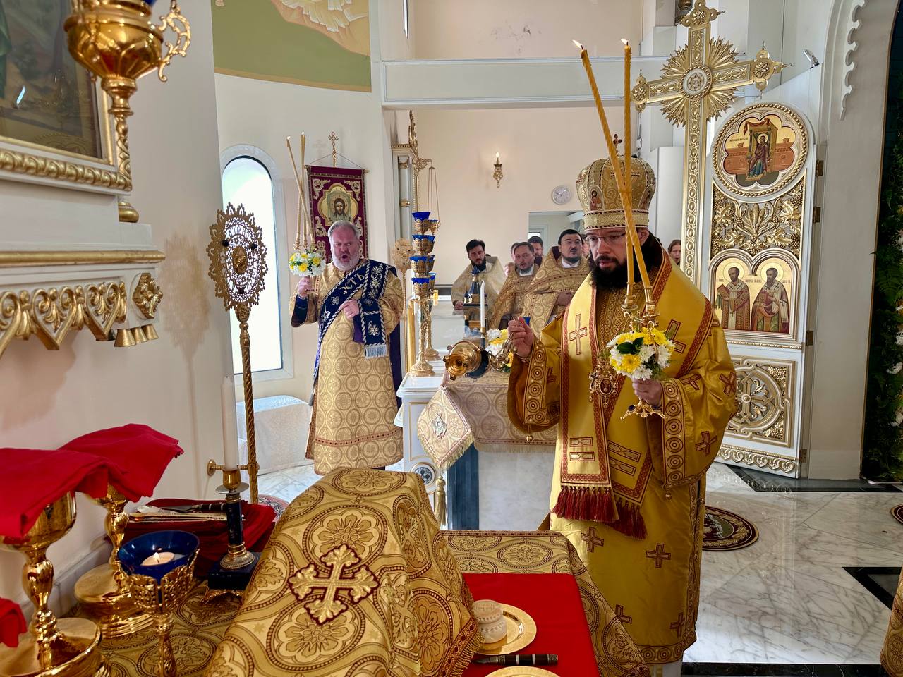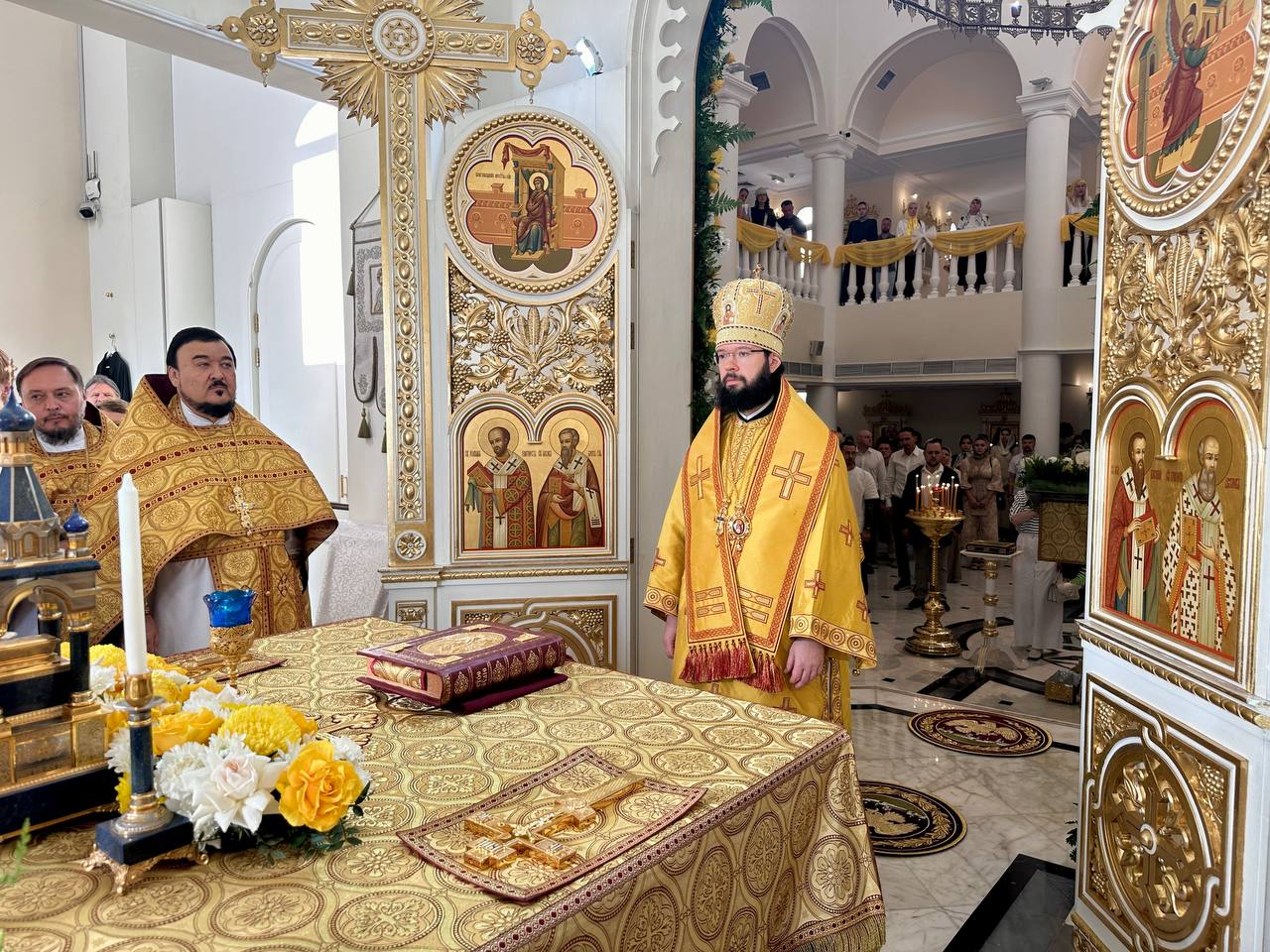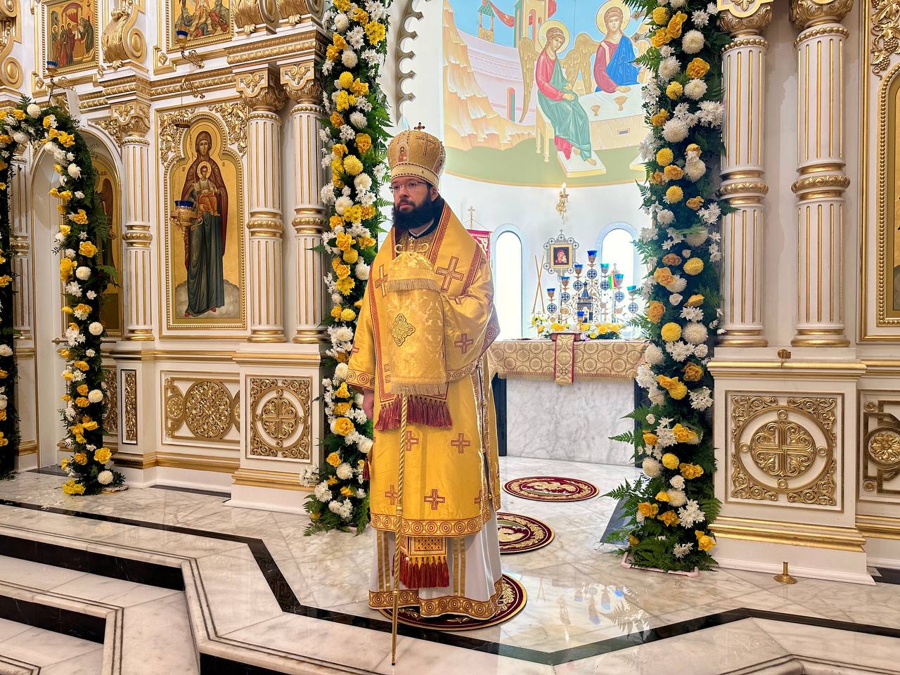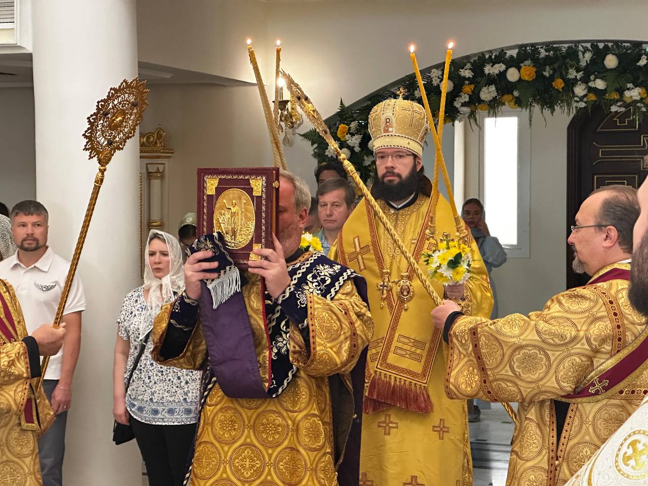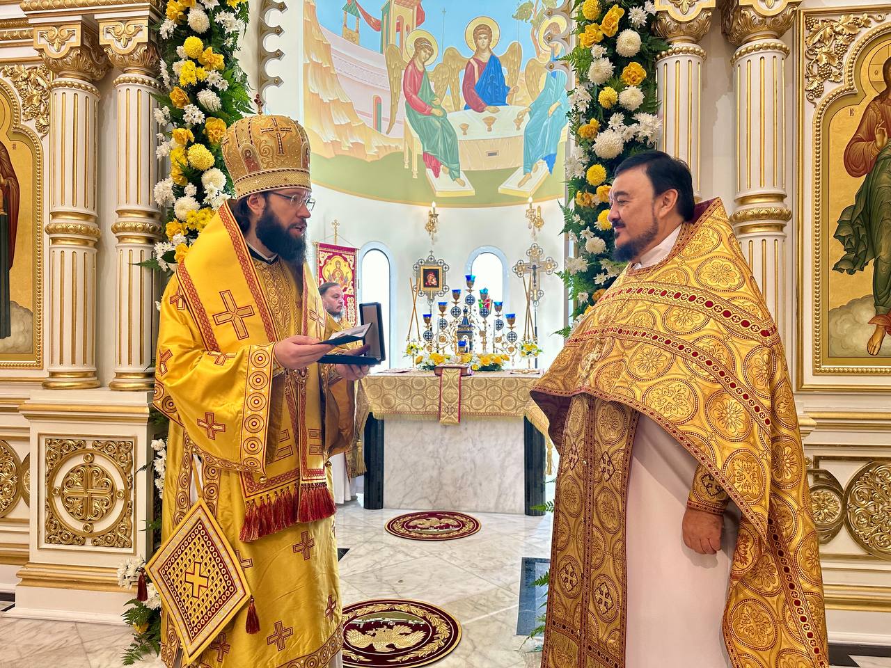 После богослужения архимандрит Александр (Заркешев) обратился к митрополиту Антонию со словами приветствия, поблагодарив его за совершение Литургии в день, когда приход отмечает престольный праздник своего храма.