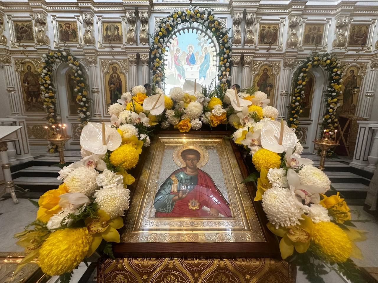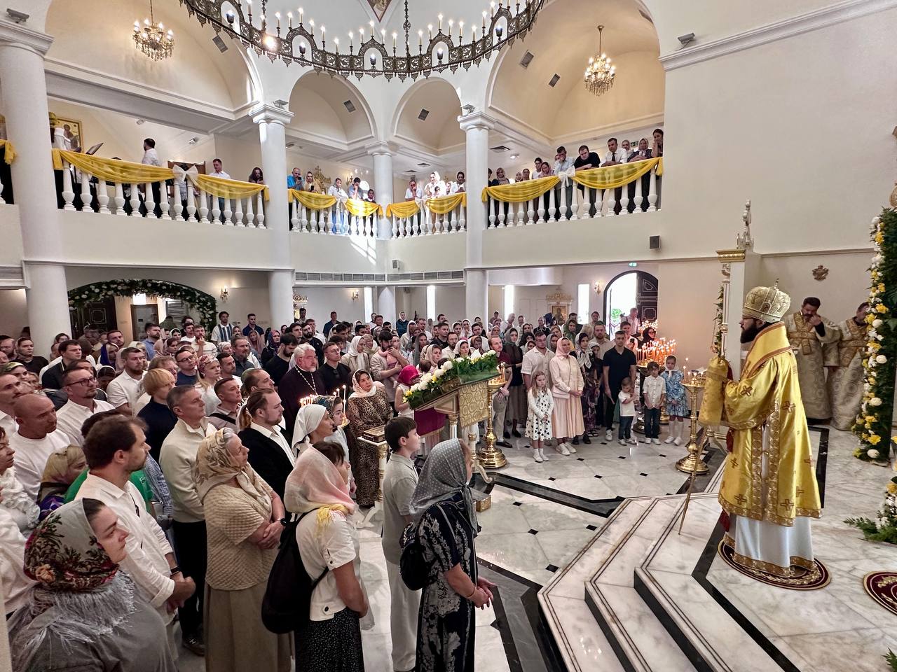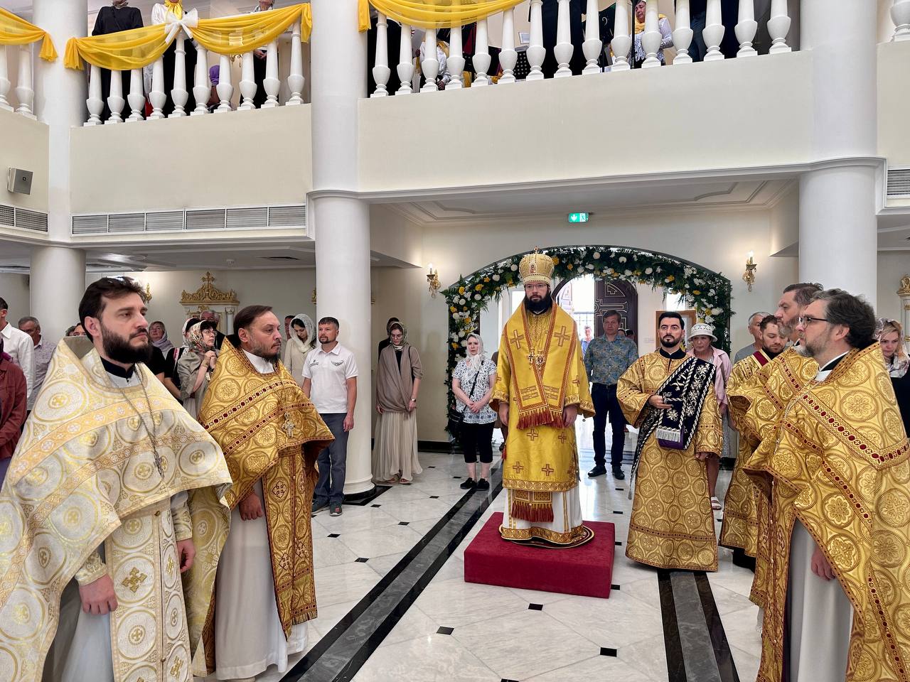 Праздничную Божественную литургию возглавил председатель Отдела внешних церковных связей Московского Патриархата митрополит Волоколамский Антоний. Архипастырю сослужили настоятель храма архимандрит Александр (Заркешев), заместитель председателя ОВЦС протоиерей Игорь Выжанов, секретарь ОВЦС по делам дальнего зарубежья протоиерей Сергий Звонарёв, клирик Свято-Николаевского храма в Тегеране игумен Варлаам (Дульский), сотрудник Секретариата ОВЦС по делам дальнего зарубежья иеромонах Кирилл (Перегудин), помощник председателя ОВЦС священник Александр Ершов. Диаконский чин был представлен протодиаконом Константином Марковичем и диаконом Алексием Костиным.