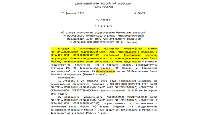 Наглости банка Слуцкера не выдержали даже власти в 1990-х. Скриншот страницы сайта pravo.gov.ru