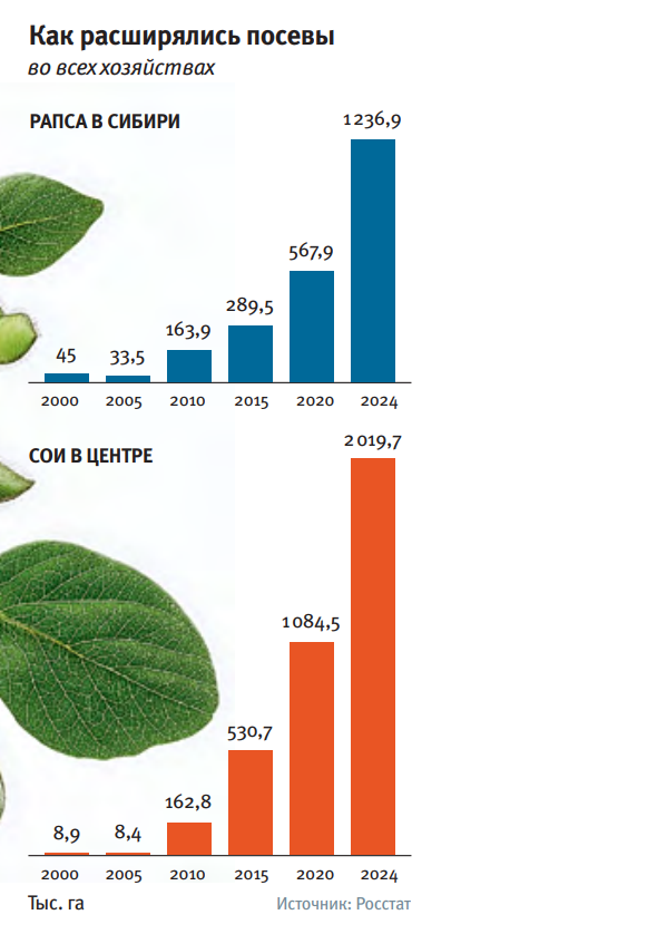 Аналитический центр Ruseed прогнозирует дальнейший рост площадей сои. В 2025 году сельхозпроизводители под нее отвели 4,6 млн га, что на 680 тыс. га больше, чем в 2024-м. Наибольший прирост опять же был зафиксирован в Сибири. Там площадь под соей превысила 500 тыс. га. Но снова эксперты связывают это не столько с благоприятными климатическими условиями, сколько с устойчивым спросом со стороны пищевой и кормовой промышленности.