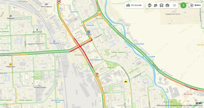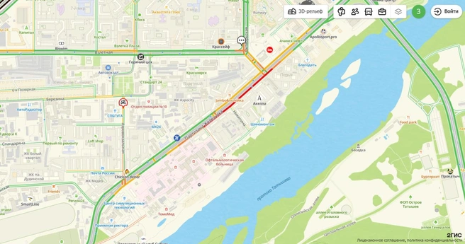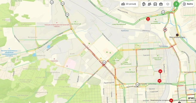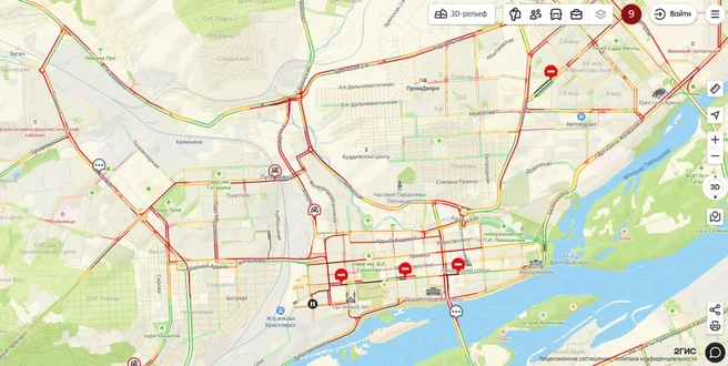Прямо сейчас в Красноярске, судя по сервису «2ГИС», пробки всего три балла, однако на некоторых участках дорог заторы сохраняются. Вот где сложнее всего проехать: