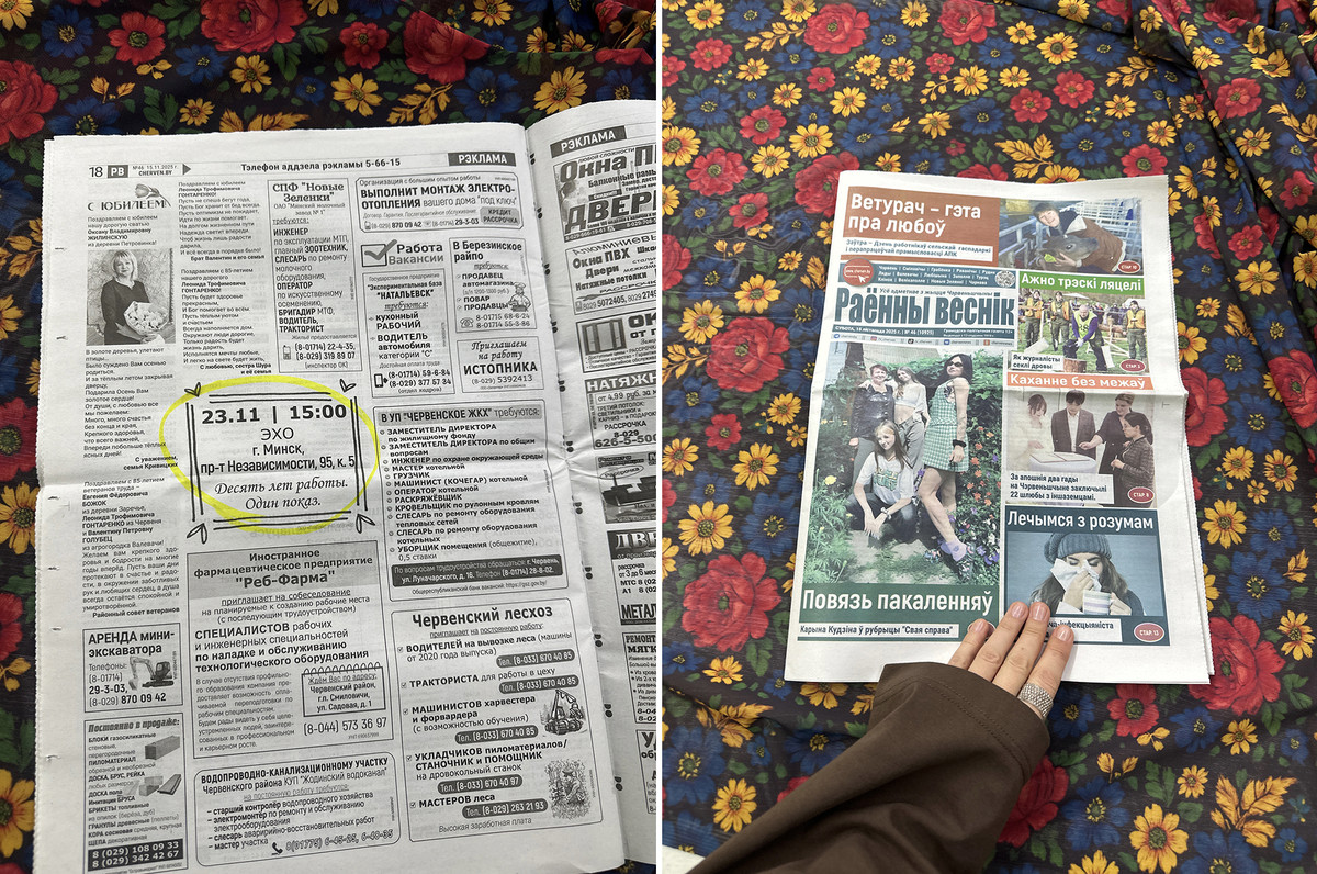 Еще один элемент перформанса зрители показа увидели за несколько дней до его начала: гостям выслали пригласительные в виде настоящего номера червенской районной газеты, где на странице с объявлениями можно было найти дату и время шоу. Это оммаж на легендарного модельера-анонима Мартина Маржела, который провернул подобное для своего первого показа в 1980-х.