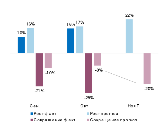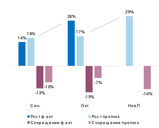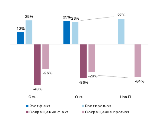 Компонента Кадры ослабла после роста в сентябре. Сокращение штата увеличилось на 4 п.п. до 25%, в 1,5 раза превысив наём новых сотрудников (16%).