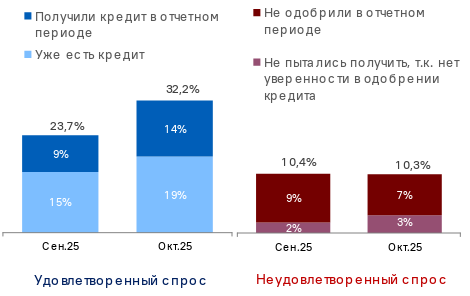 На фоне смягчения денежно-кредитной политики и оживления сбыта, приведшего к росту потребности предприятий в оборотных средствах, совокупный спрос МСП на кредиты достиг максимума с февраля 2022 года (42%). 32% компаний сообщили о наличии кредита (против 24% в сентябре), также в октябре кредит был одобрен 14% предприятий (+5 п.п.). До минимума с сентября 2024 года снизилась доля компаний, не готовых брать займы из-за высоких ставок (25%; - 5 п.п.). Доля респондентов, которые не смогли получить кредит, также уменьшилась - до 7% (-2 п.п.) - и вернулась к уровню марта 2025 года.