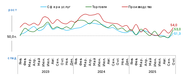 Индекс сферы услуг вернулся в зону сдержанного роста деловой активности, а индексы производства и торговли – в зону активного роста, обновив максимумы с весны.