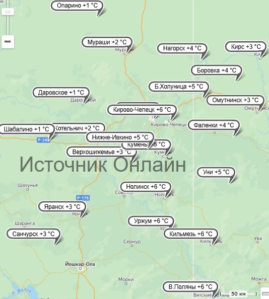 Так, в ВятскихПолянах, Кильмези, Уржуме и Кирово-Чепецке в 7 утрасиноптикизафиксировали +6 градусов, в БелойХолунице и Унях– +5 градусов, в Кирове– +4 градуса.