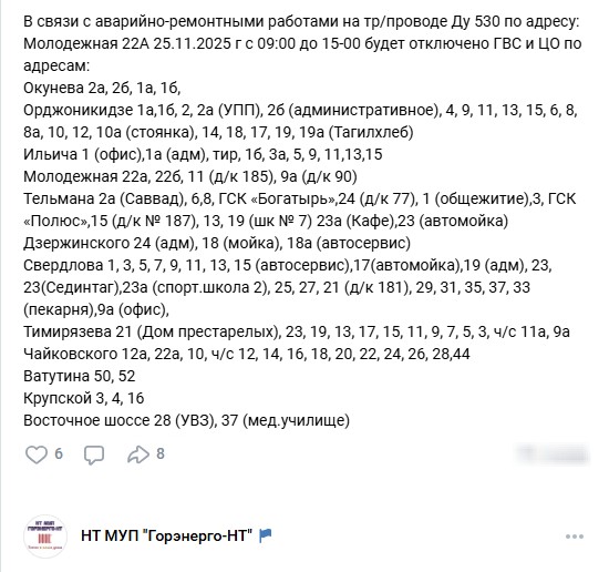 Напомним, днем ранее центральная часть Нижнего Тагила осталась без холодного водоснабжения. Как сообщили в Водоканале отключение произошло из-за коммунальной аварии на трубопроводе. Под отключение попали здания на проспекте Ленина, улицах Ломоносова и Карла Маркса (в том числе НТКИ и два детских сада «Солнышко»).