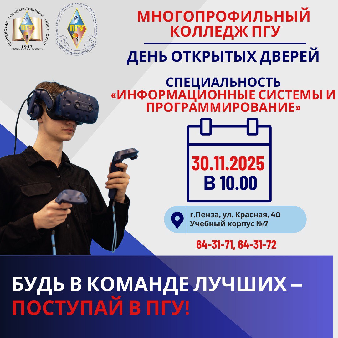 День открытых дверей пройдет 30 ноября в 10:00 в аудитории 7а–425 и на базе Центра компетенций в 7-м корпусе ПГУ (г. Пенза, ул. Красная, 40).