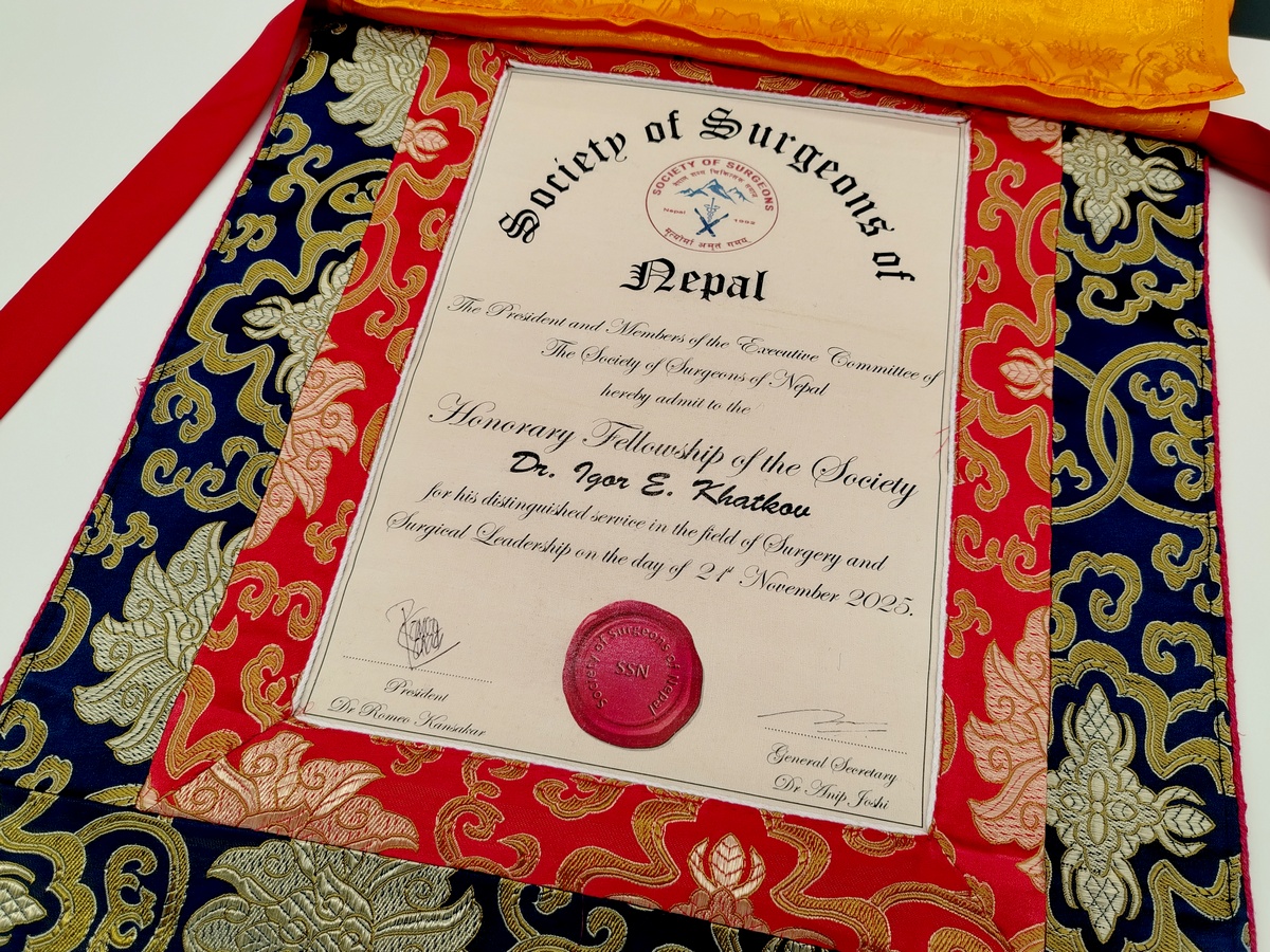 Знаменательным событием мероприятия стало официальное утверждение Игоря Хатькова в качестве почётного члена сообщества хирургов Непала. Такое признание не случайно – Игорь Хатьков является одним из ведущих мировых специалистов в лапароскопической хирургии, на счету которого множество самых сложных операций и огромный опыт лечения онкологических пациентов.