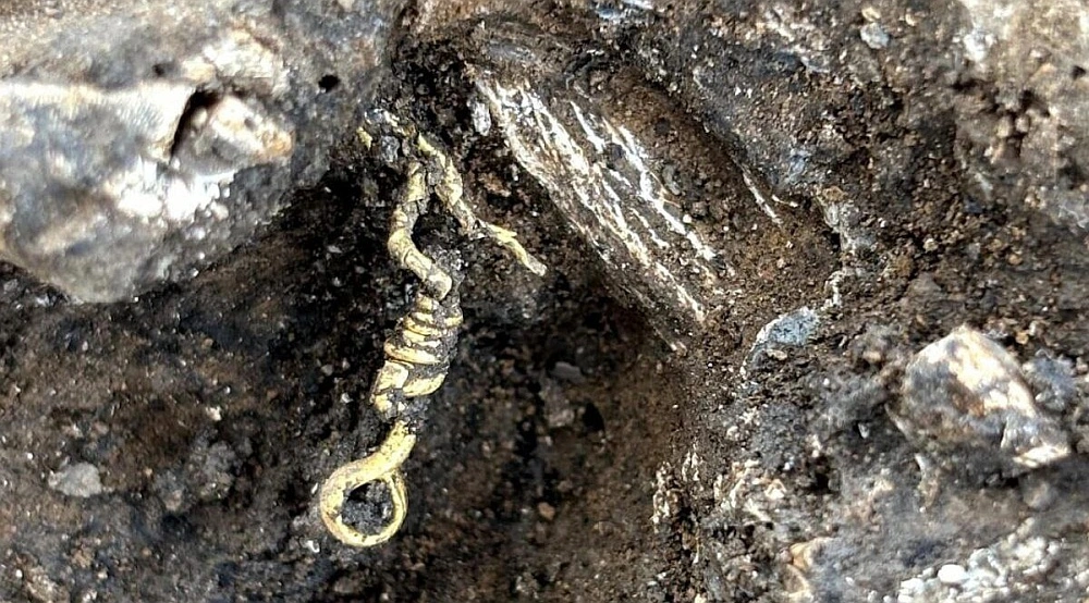 Но главное сокровище - 22 золотых предмета: листы, тонкие проволочки, каплевидные детали. Особенно выделяются три вещи. Первая - браслет из витой золотой ленты с кольцевой застежкой. Вторая - подвеска типа буллы, маленький "флакончик", который в римской традиции носили дети из состоятельных семей как оберег. Третья - кольцо с глубокой гравировкой. Оно деформировалось от высокой температуры, но на плоской части все еще читаются семь греческих букв: Allallé. Камень, вероятно из горного хрусталя, еще предстоит изучить. Не исключено, что это личное имя владельца, что может намекать на греческое происхождение или связи семьи.