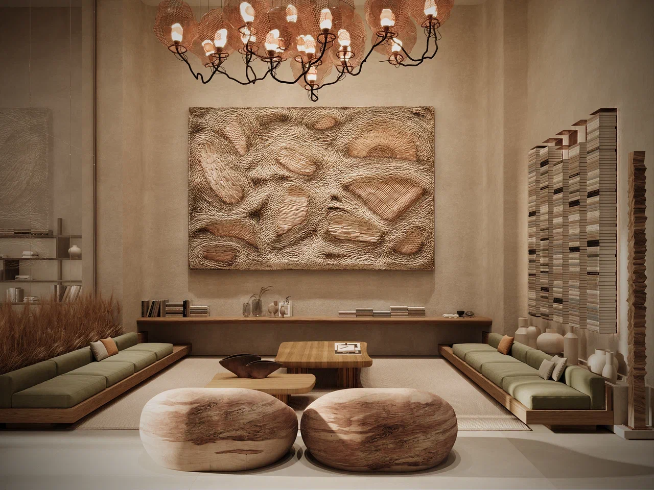 Но интерьеры лобби – не просто отсылки к природе: в них зашит культурный код аутентичных мест и регионов России. Для этого дизайнеры прибегли к помощи ремесленников и мастеров. Например, Руслан Мазлоев изготовил плетёное панно из рогоза, а Ольга Воронская и Наталья Косовец – из войлока. Наталья Макарова представила работы из жгута и глины, Ольга Малыгина собрала диптих из мозаики, а Светлана Вронски создала предметы декора в технике валяния из шерсти.
