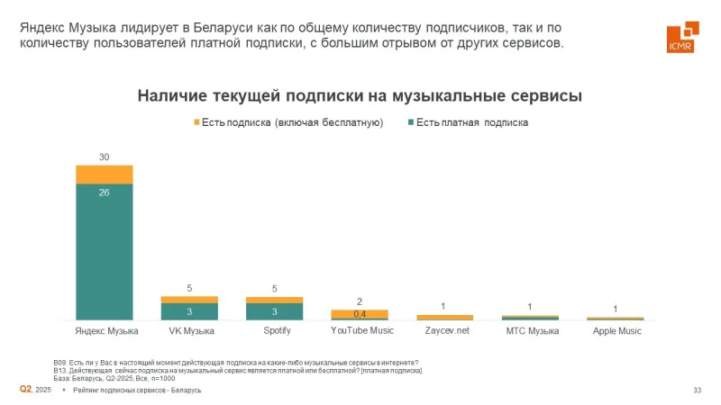 В рамках исследования онлайн-сервисов, проведенного ICMR (ГФК-Русь), были проанализированы показатели пользовательского поведения в Республике Беларусь за второй квартал 2025 года. Исследование охватило онлайн-кинотеатры и музыкальные стриминговые сервисы.