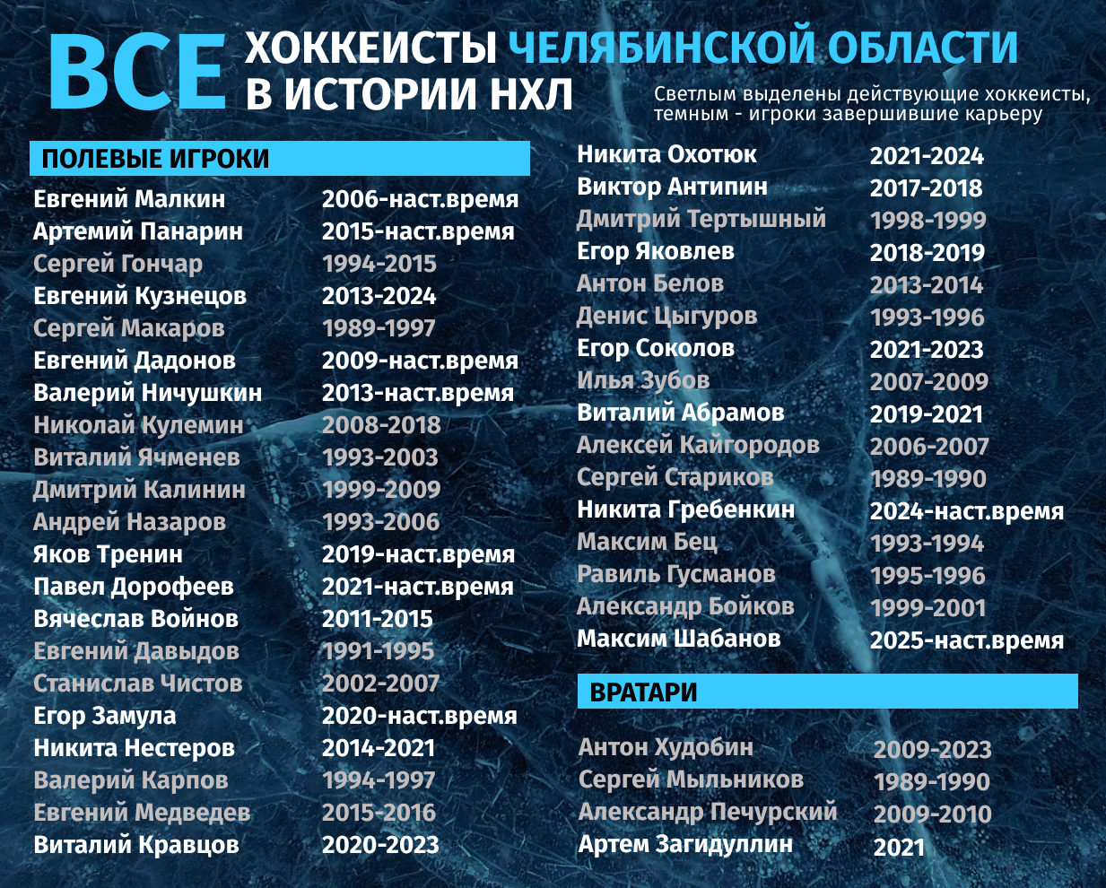 Ну и напоследок публикуем имена всех воспитанников челябинской школы хоккея. Они ранжированы по количеству набранных очков от наибольшего к меньшему по состоянию на начало сезона-2025/26. Выделены жирным те игроки, которые продолжают карьеру. В нашем списке получился 41 хоккеист. А у вас?