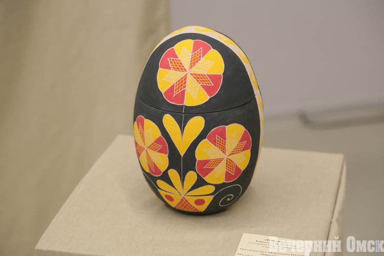 Рядом с тарелками стоят необычные керамические сосуды в форме яиц – результат творческого союза мастера по писанкам Натальи МОРОЗКИНОЙ и гончара Юлии НИКИФОРОВОЙ.