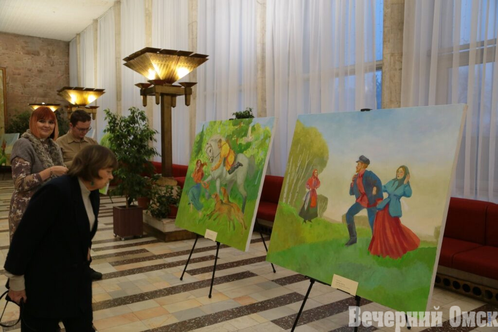 В фойе Музыкального театра развернулась выставка картин якутской художницы Миры АРГУНОВОЙ «Над временем». Эти полотна родились из погружения в экспедиционные материалы – фотографии, расшифрованные тексты, звучащие песни. У каждой из 15 картин на выставке была своя песня-вдохновитель. Эти мелодии собирали в селах Крестики Омской области, Первокаменка Алтайского края и Большой Куналей Бурятии. И в перформансе зрители услышали именно их – те самые песни, что стали для художницы источником вдохновения.