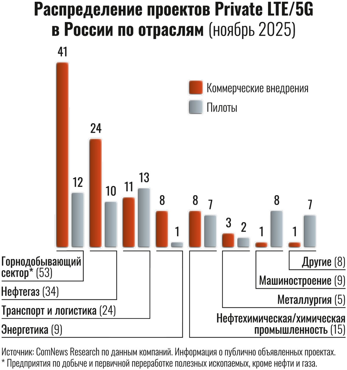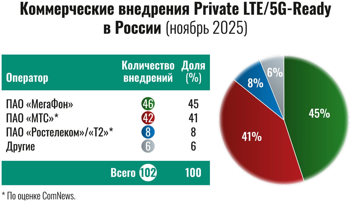 Согласно опросу ComNews, по состоянию на ноябрь 2025 года в России развернуто 102 коммерческие сети Private LTE, и большинство из них – с участием операторов связи.