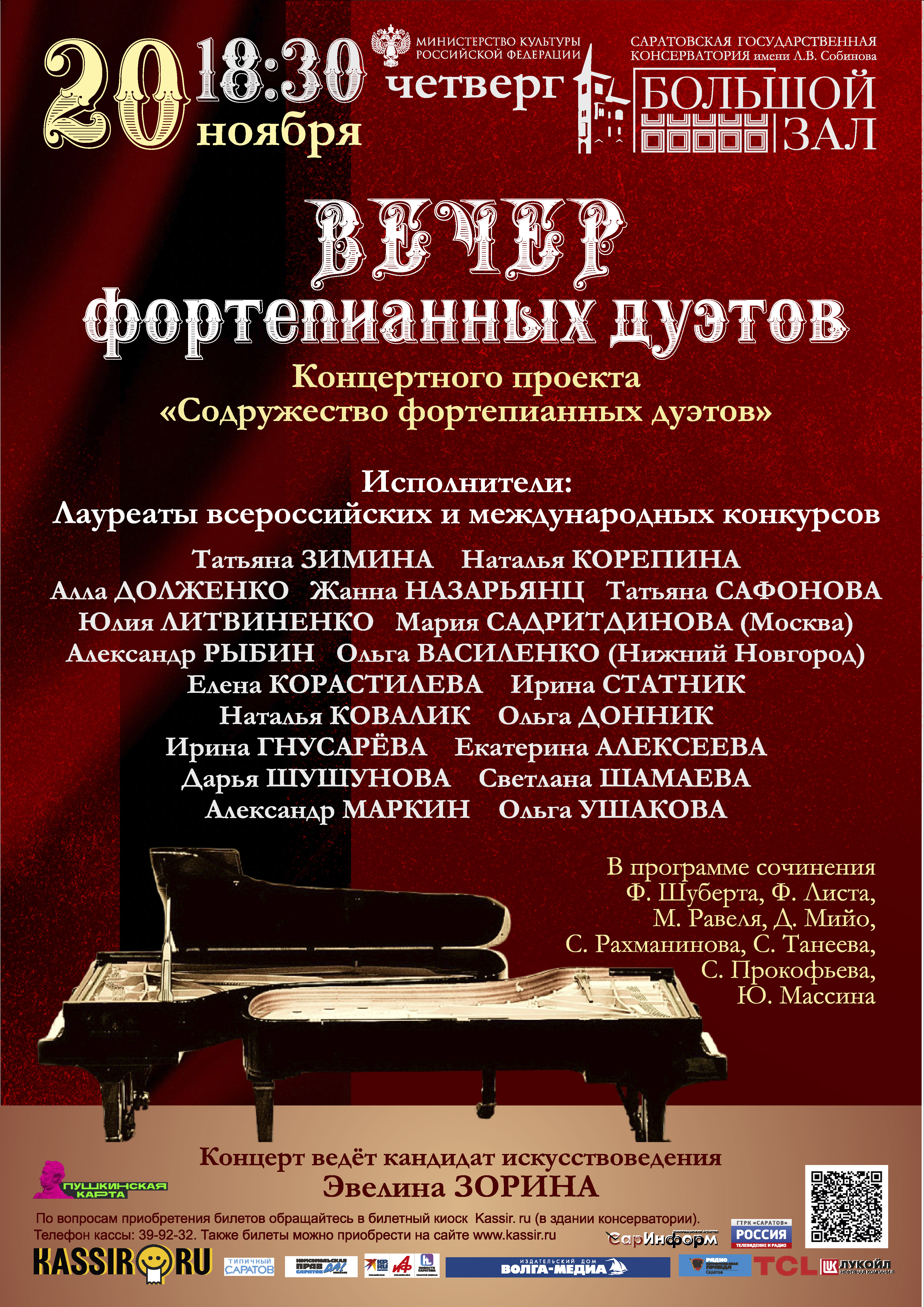 20 ноября в Большом зале консерватории успешно прошёл «Вечер фортепианных дуэтов» в рамках концертного проекта «Содружество фортепианных дуэтов».