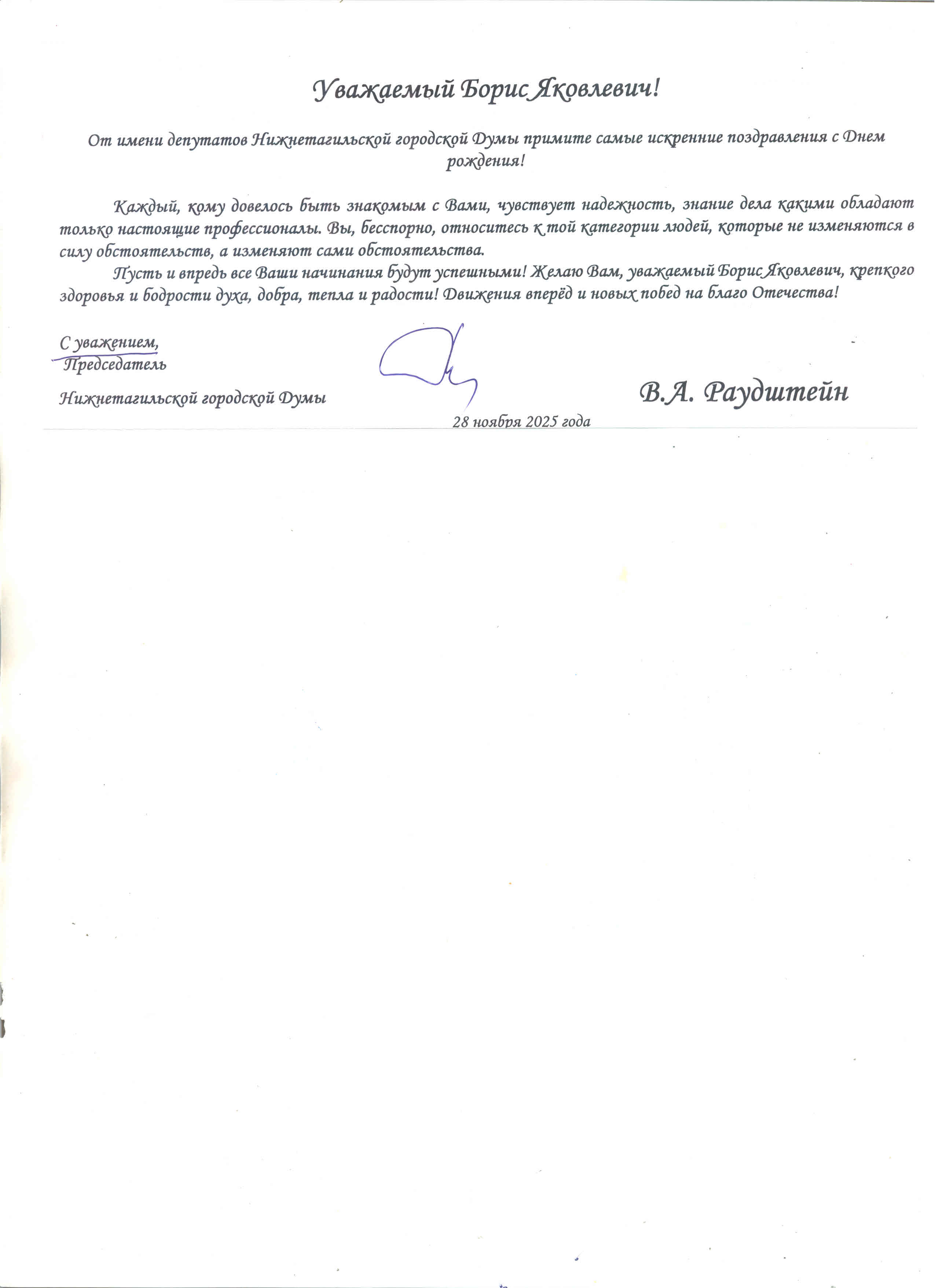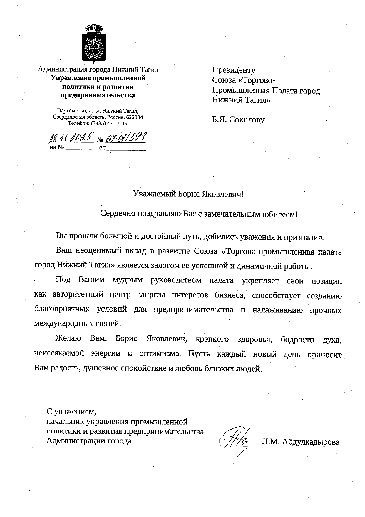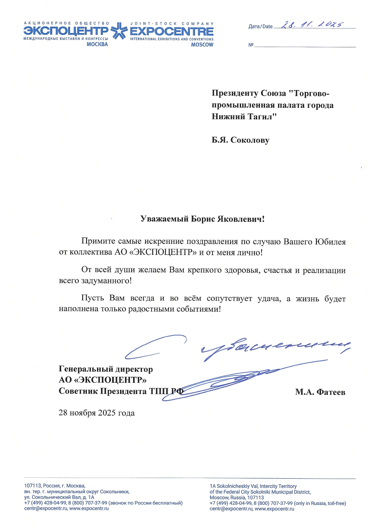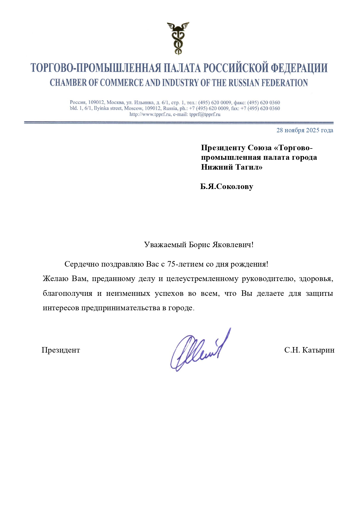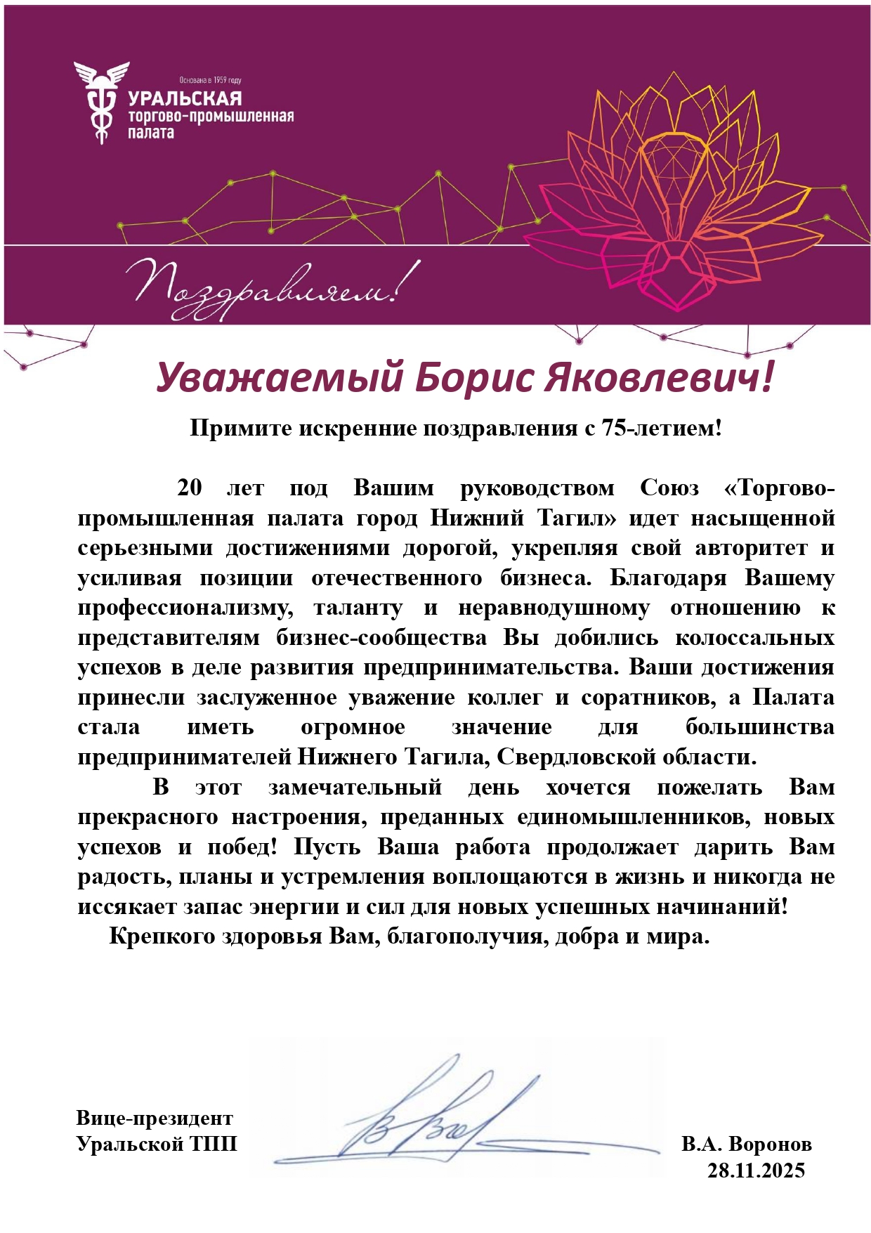 28 ноября 2025 г. 75-летний юбилей отмечает президент Союза «Торгово-промышленная палата город Нижний Тагил» Борис Соколов.