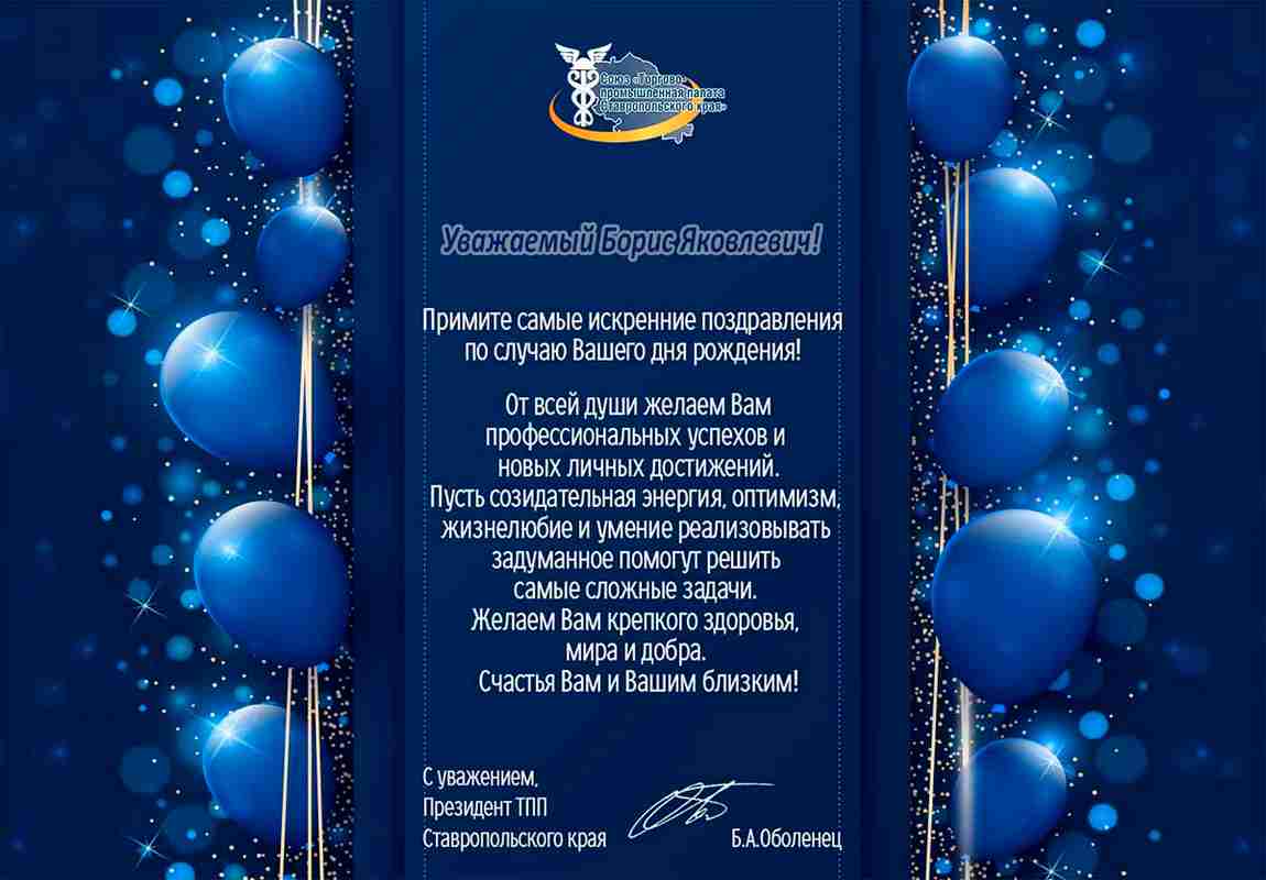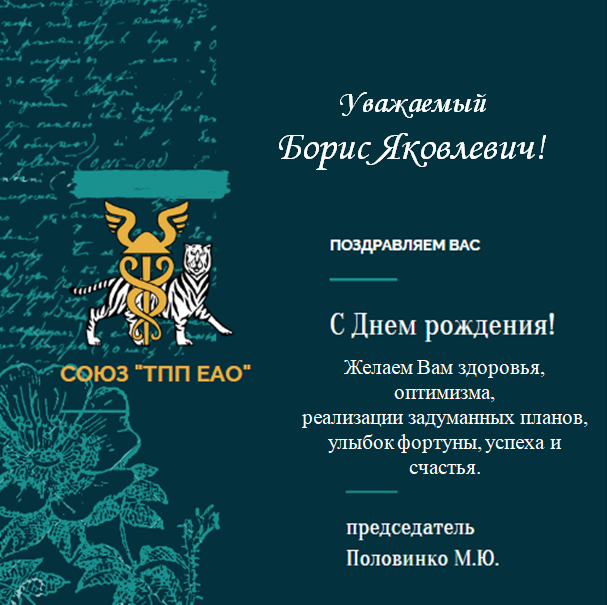 Коллектив ТПП НТ поздравляет Бориса Яковлевича с ЮБИЛЕЕМ! 75 лет — это целая жизнь, наполненная интересными событиями и значимыми свершениями. Желаем самого крепкого здоровья. Пусть в сердце всегда горит огонь, а в душе никогда не погаснут мечты. Радости Вам, счастья и бодрого настроения!