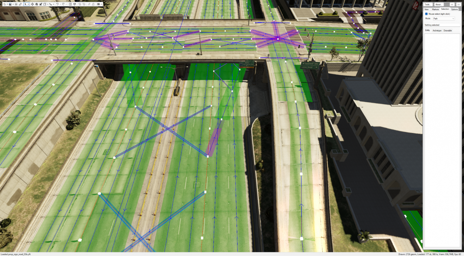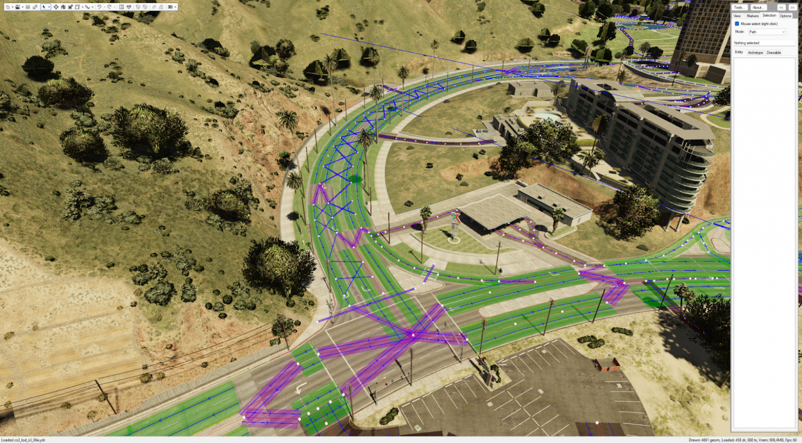 В очередной раз обращаемся к поисковику, но теперь с более конкретным запросом. Довольно быстро нашелся сайт с пользовательскими модами для разных игр серии GTA, дающий немало полезной информации. Помните, я выше писал, что водители-NPC совершают перестроения только в определенных местах. Собственно, в этих местах, если верить сайту, и расположены те самые узлы (traffic nodes, или path nodes), связанные друг с другом путями (pathways). Они-то и определяют, в каком направлении транспорт под управлением бота продолжит движение. Более того, если верить сайту, то имея под рукой программы для моддинга вроде OpenIV или CodeWalker, можно взять дорожную ситуацию в игре под полный контроль.